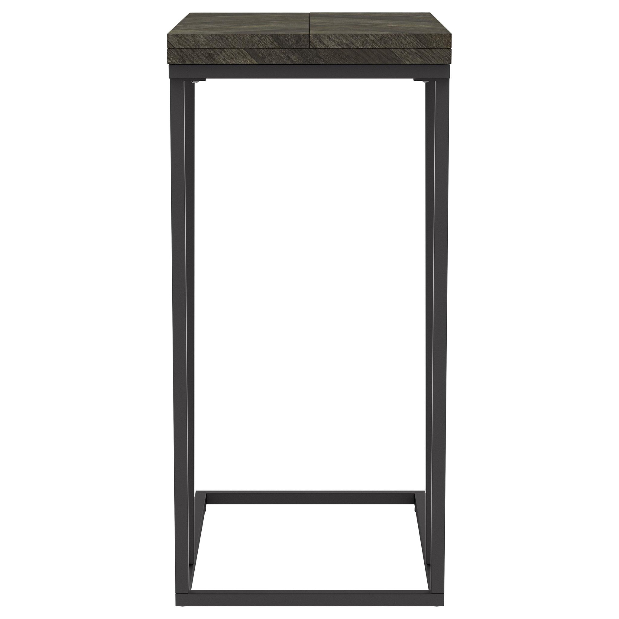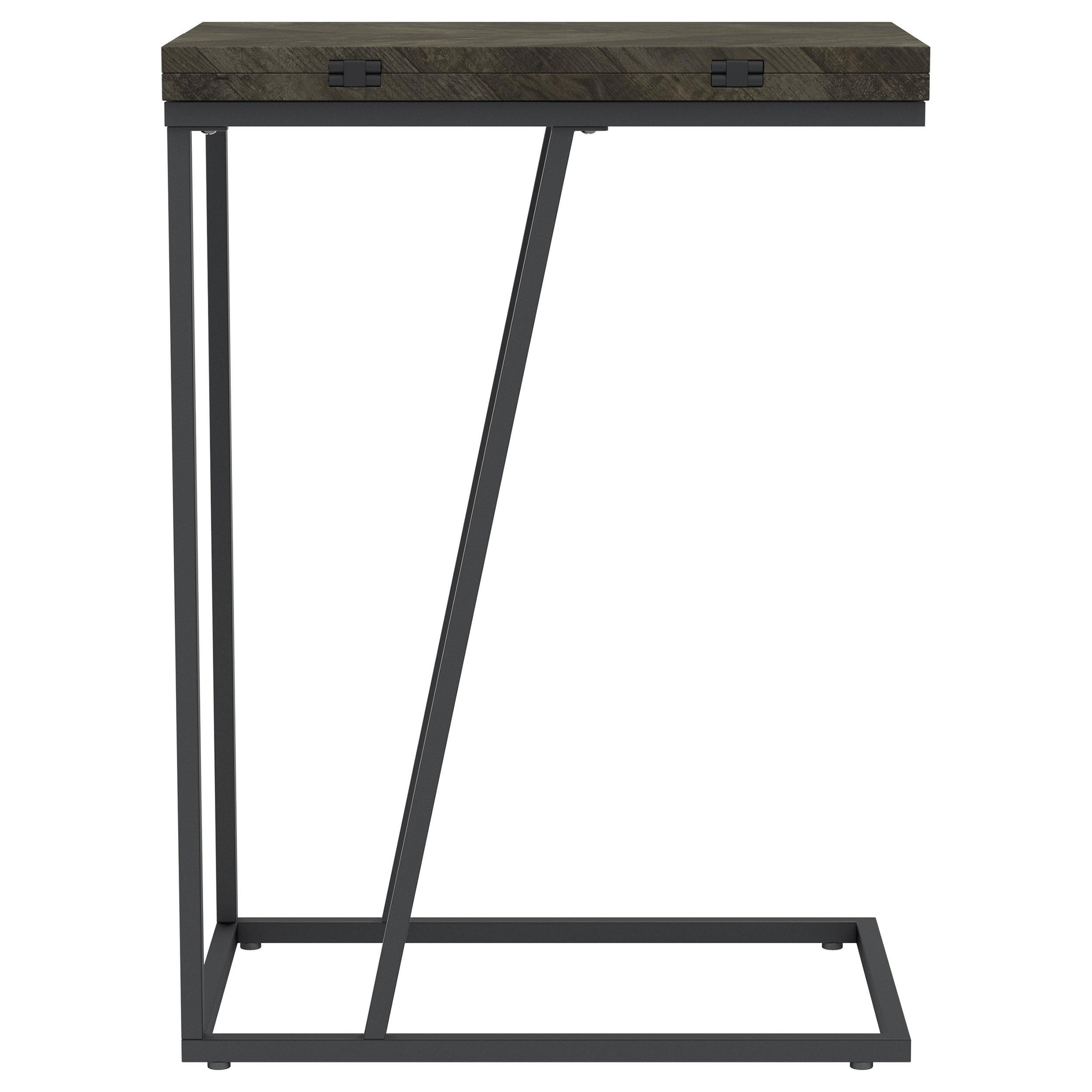 This versatile C-table combines functionality and sleek design, perfect for modern living spaces. Crafted with an engineered wood top featuring a scratch-resistant rustic grey laminate veneer, it offers durability and style. The top folds out, providing expanded surface area when needed. Supported by a sturdy metal base with a sandy black powder coated finish, it blends practicality with elegance. Its slim profile allows it to slide easily under sofas or chairs, making it an ideal space-saving solution.