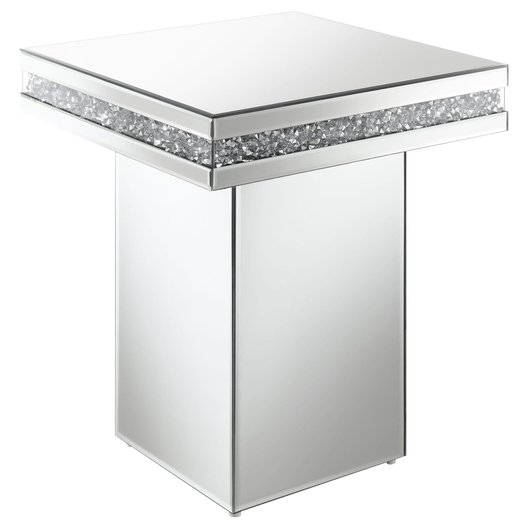 Showcase sculptures and decor on this stunning, modern glam accent table. A square table sits on a tall square pedestal for an edgy, bold expression. Smooth mirror trim and surfaces cover every edge, creating a sleek flair. Glittering acrylic crystals line the interior of a clear center band for an elevated luxurious touch. Small disguised feet offer a subtle elevation over rugs and floors and offer extra stability.
