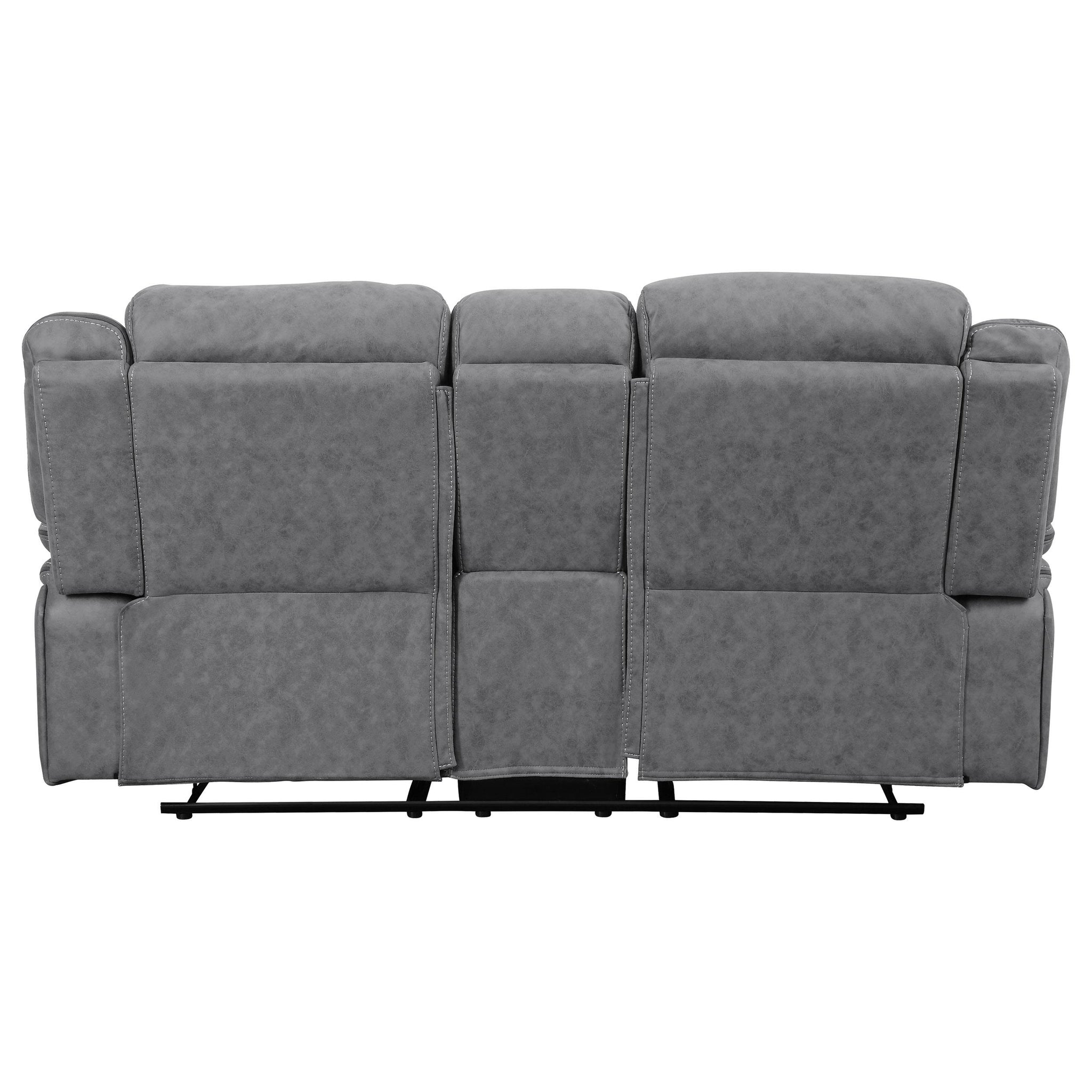 Reclining loveseat upholstered in grey performance faux suede with stylish stitching