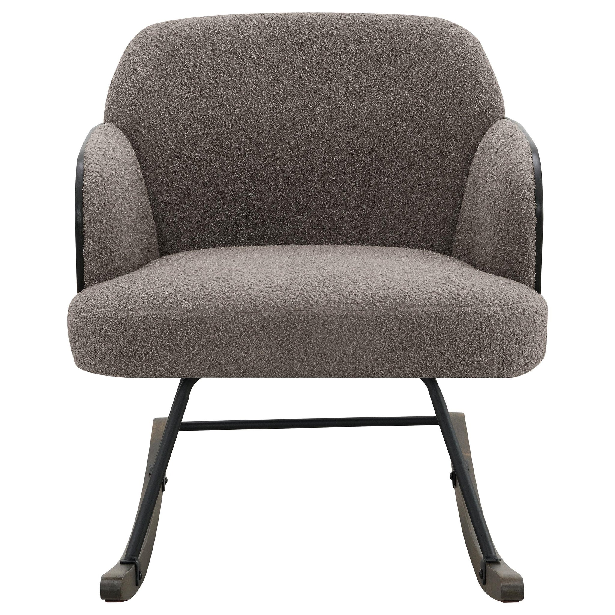 This modern rocking chair blends cozy comfort with sophisticated design, making it an ideal addition to any contemporary home. The plush boucle fabric upholstery wraps the seat and backrest, providing a soft and inviting surface. The walnut-finished bentwood frame adds warmth and elegance, while the curved wooden rockers and sturdy metal legs ensure smooth, stable motion. Whether used in a living room, nursery, or reading nook, this chairs sleek, modern silhouette complements a variety of interiors. Combining high-quality materials and a striking design, this rocker offers both style and comfort for your favorite spaces.