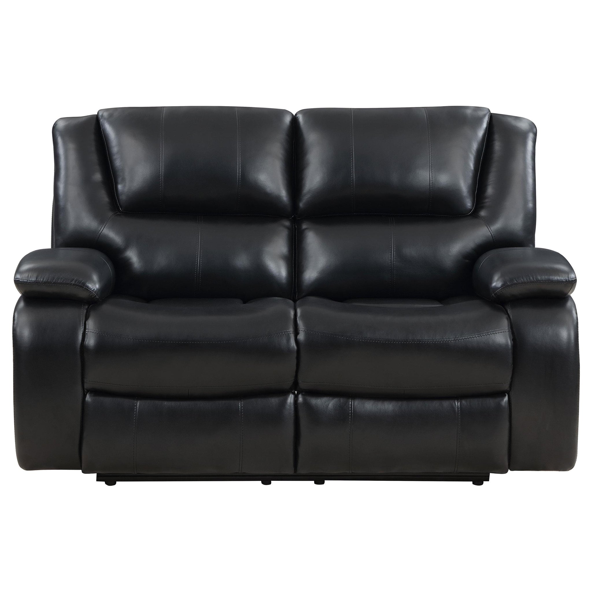 Bold black leatherette upholstery offers the look of luxurious leather with easy-care maintenance as the two-piece motion sofa set is versatile and beautiful. Living rooms, family rooms, and media venues become comfort zones with the plump feel and clean design of a classic sofa and loveseat set built for hours of seating comfort as well as entertaining. Manual reclining is easy and pleasant, allowing a variety of positions for sitting and lounging. Choose this elegant sofa set with pillowy support, as attached seat and back cushions feature plump foam filling with channeling to target body comfort and padded armrests over rounded sides. Entertain in style and sheer comfort with a motion sofa set that’s ideal for lounging and napping.