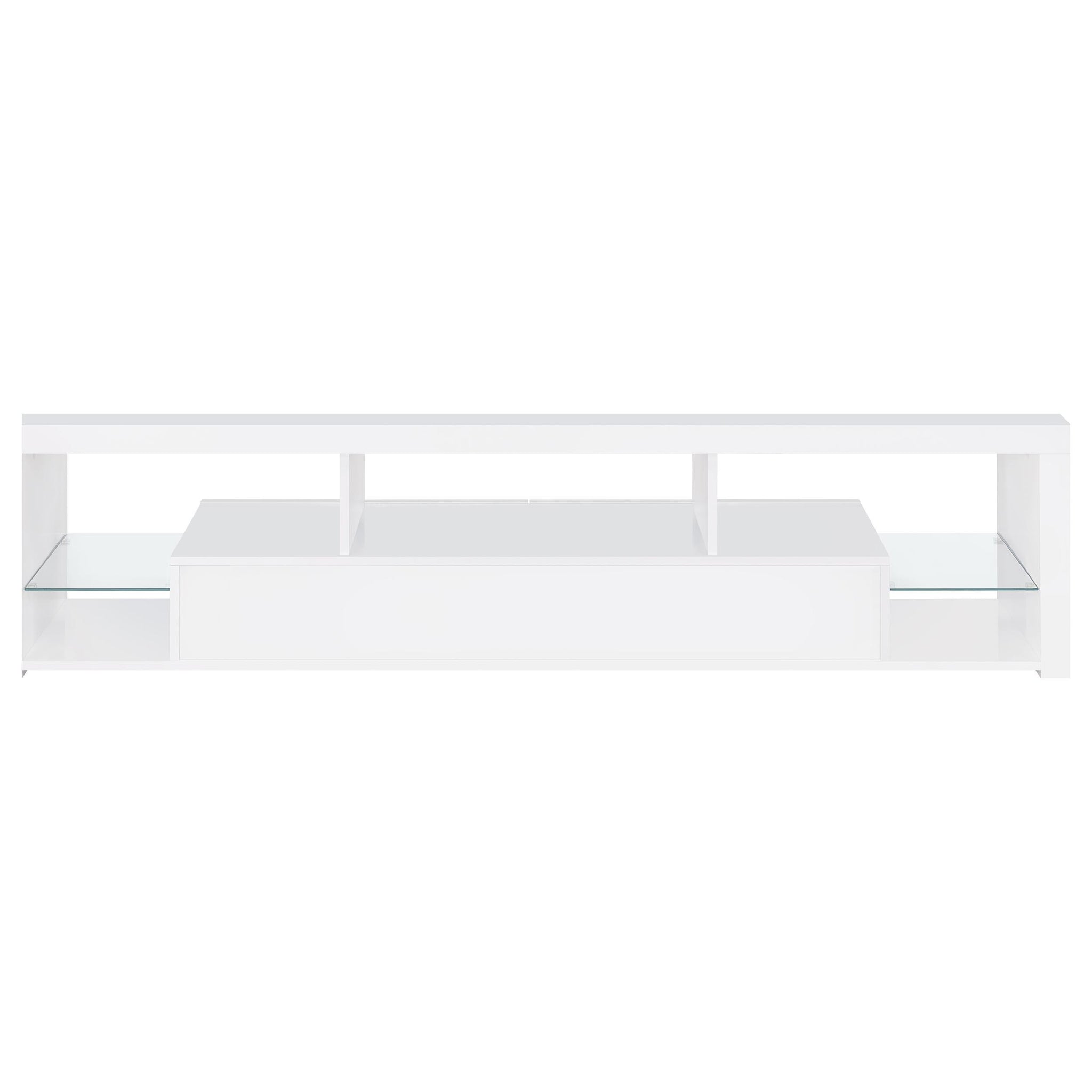 Sleek, modern TV stand with pristine glossy white finish and clear glass accents