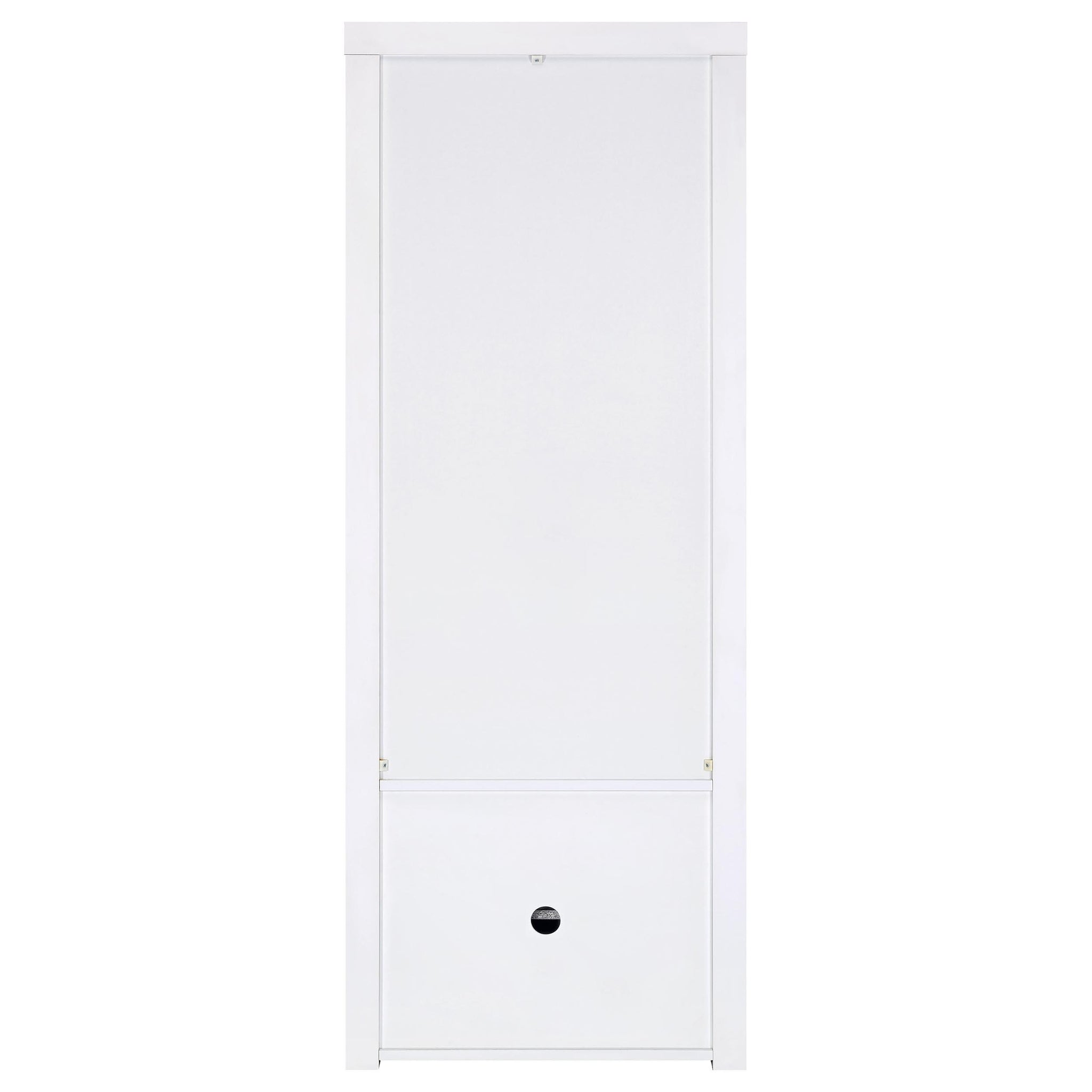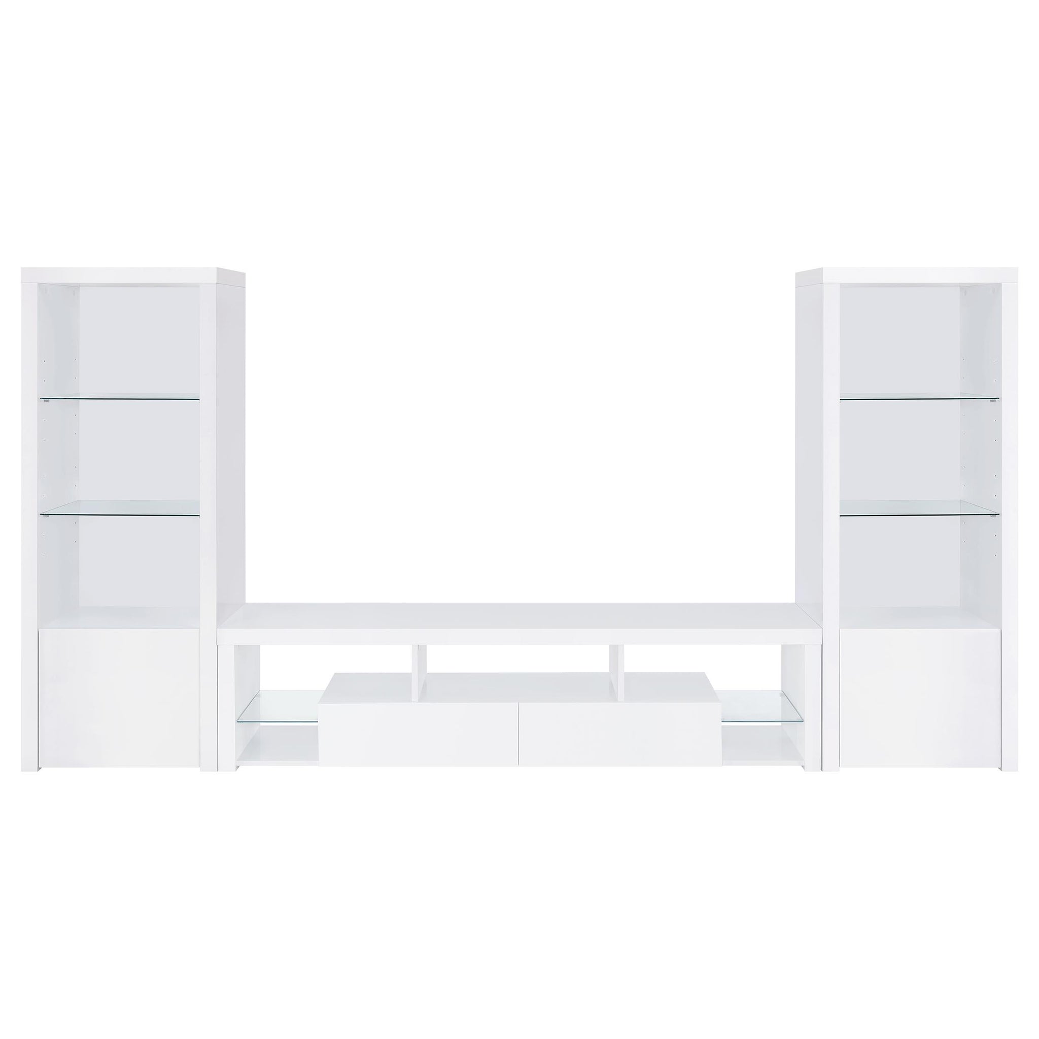 Extend a media console or add easy display space in a den or bedroom with this contemporary tower. Designed to accompany the matching media console, the tower adds a lower cabinet with shelving inside, and a pair of glass display shelves. It’s the perfect solution when both hidden and accessible storage are desired. A crisp white finish adds to the modern look and complements virtually any space. Melamine paper surfaces are designed for durability, perfect for everything from games and media to charming decor.
