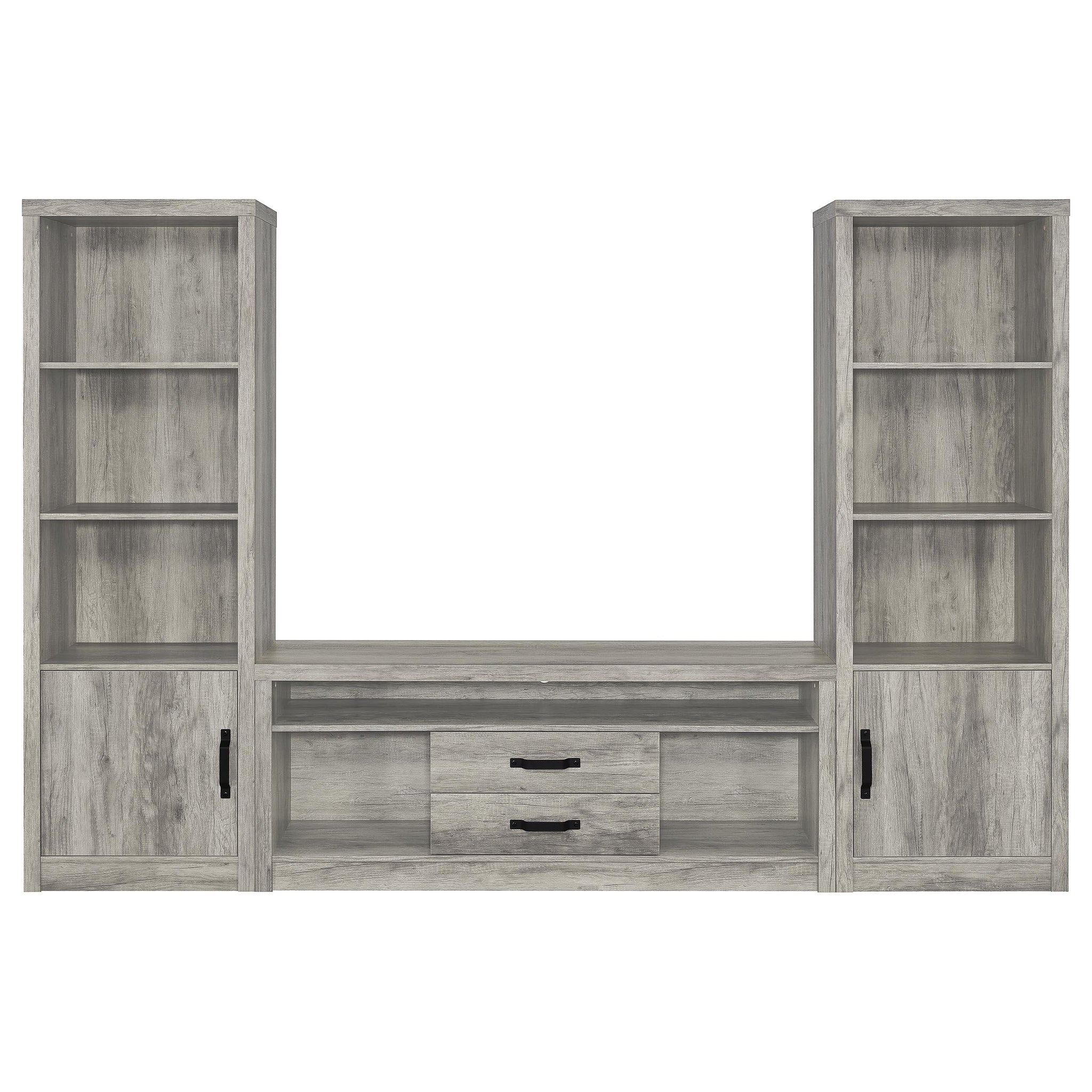 Tall and slender, this modern media tower is the perfect complement for your entertaining needs in both compact and larger spaces. Organize media, books, and implements on shelves and interior shelves, staying organized and uncluttered. Melamine construction features a distressed weathered gray finish with grain-like markings, offering rustic vibes. Find space on three fixed shelves and one adjustable shelf, all ready to separate and store gaming supplies, media, or books. A single black finished metal hardware pull offers an ideal match.