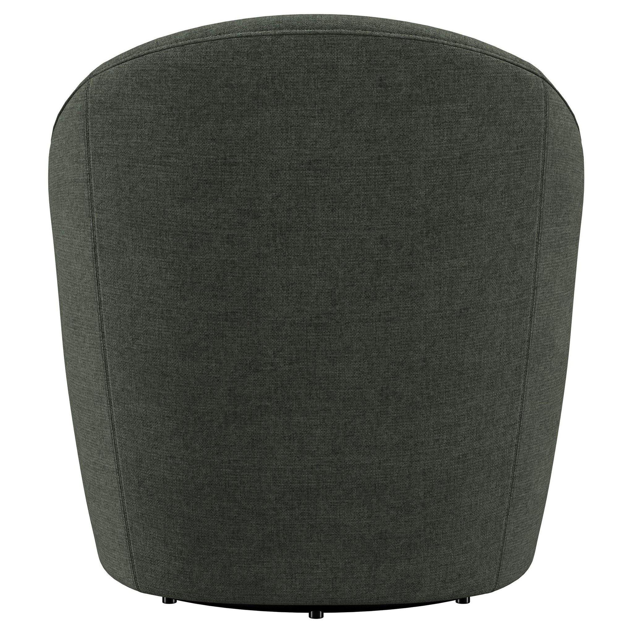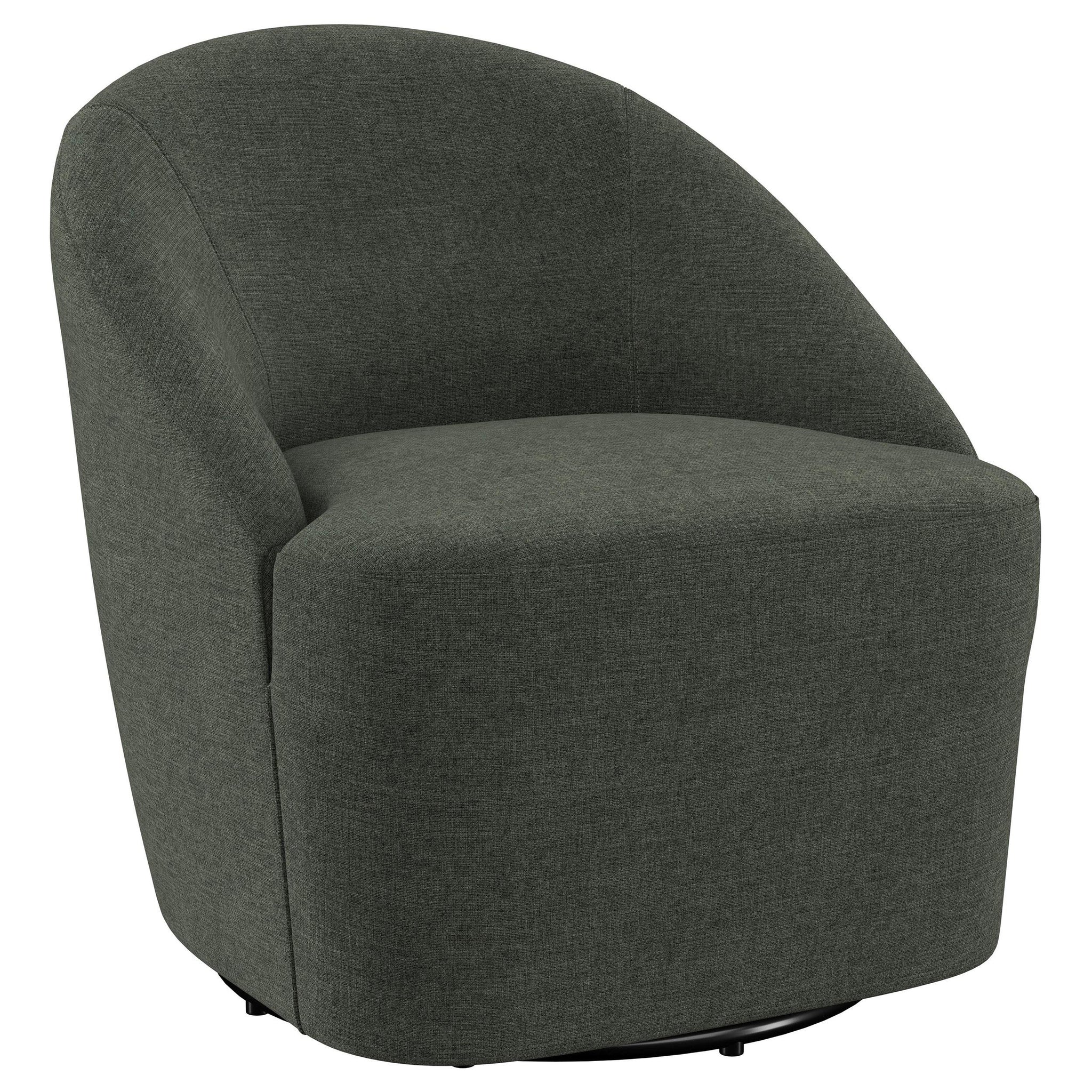 Upgrade your living room or den with the cozy, modern character of an upholstered accent chair. It swivels, encouraging conversation and offering versatility in a multifunctional living space. The chair is a take on a classic club silhouette, featuring a rounded barrel back that offers plenty of support and comfort. Soft upholstery complements in living areas and dens to equally stylish effect. The chair offers its full swivel with a metal base that adds a black finish thats unobtrusive and neutral.