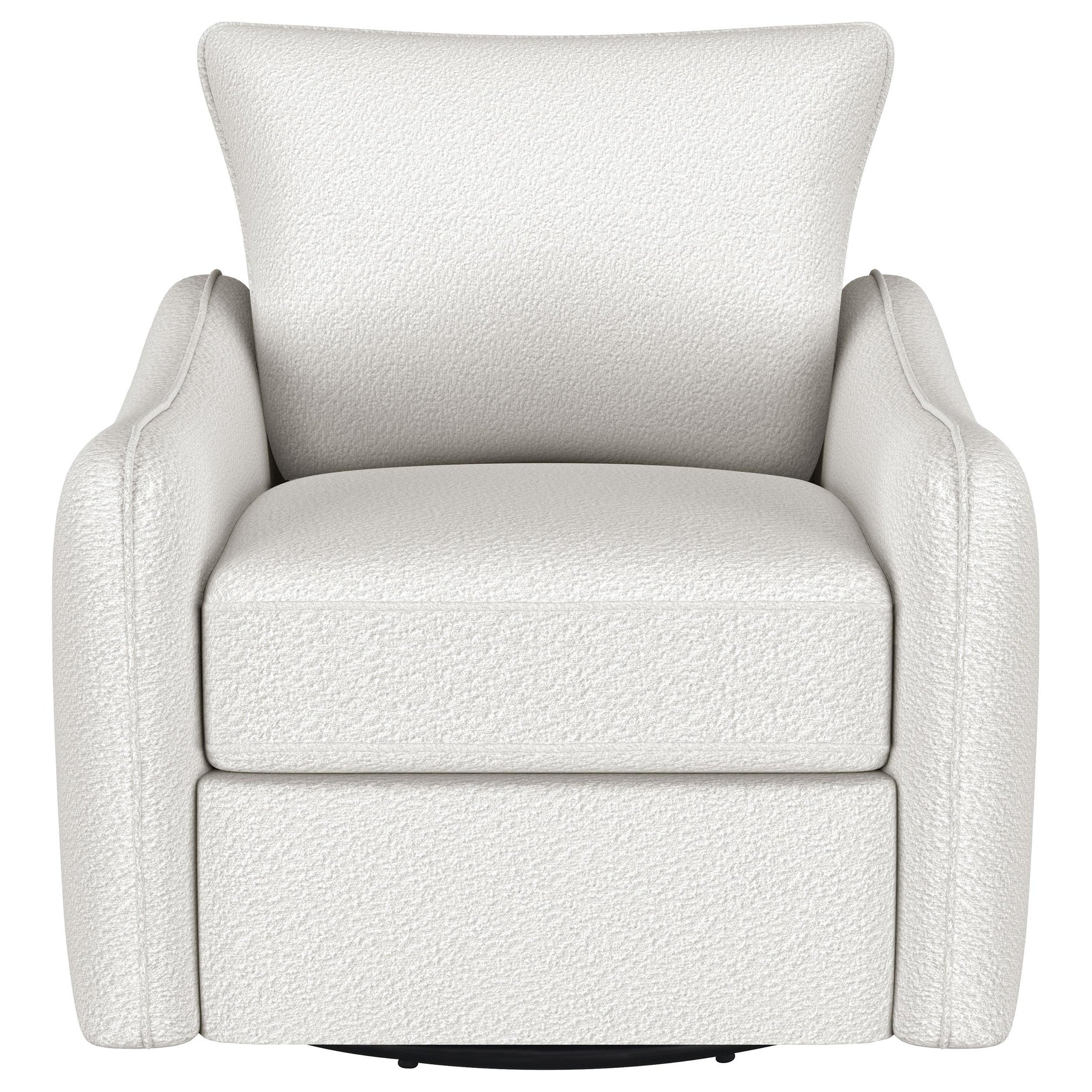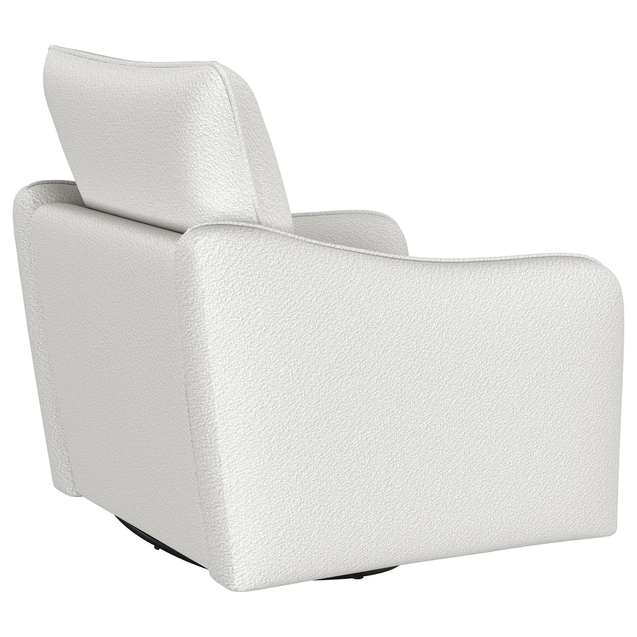 Nestled within the soft embrace of this bouclé upholstered chair, one finds a moment of tranquility. Its harmonious 360 swivel and glider functionality make each movement a fluid dance, a gentle invitation to unwind. The meticulously shaped arms, a testament to refined style, offer a restful perch for weary elbows. As the days light fades, this chair becomes a cherished haven, its silhouette a blend of comfort and contemporary charm. In this cozy nook, time slows, and serenity takes a seat.