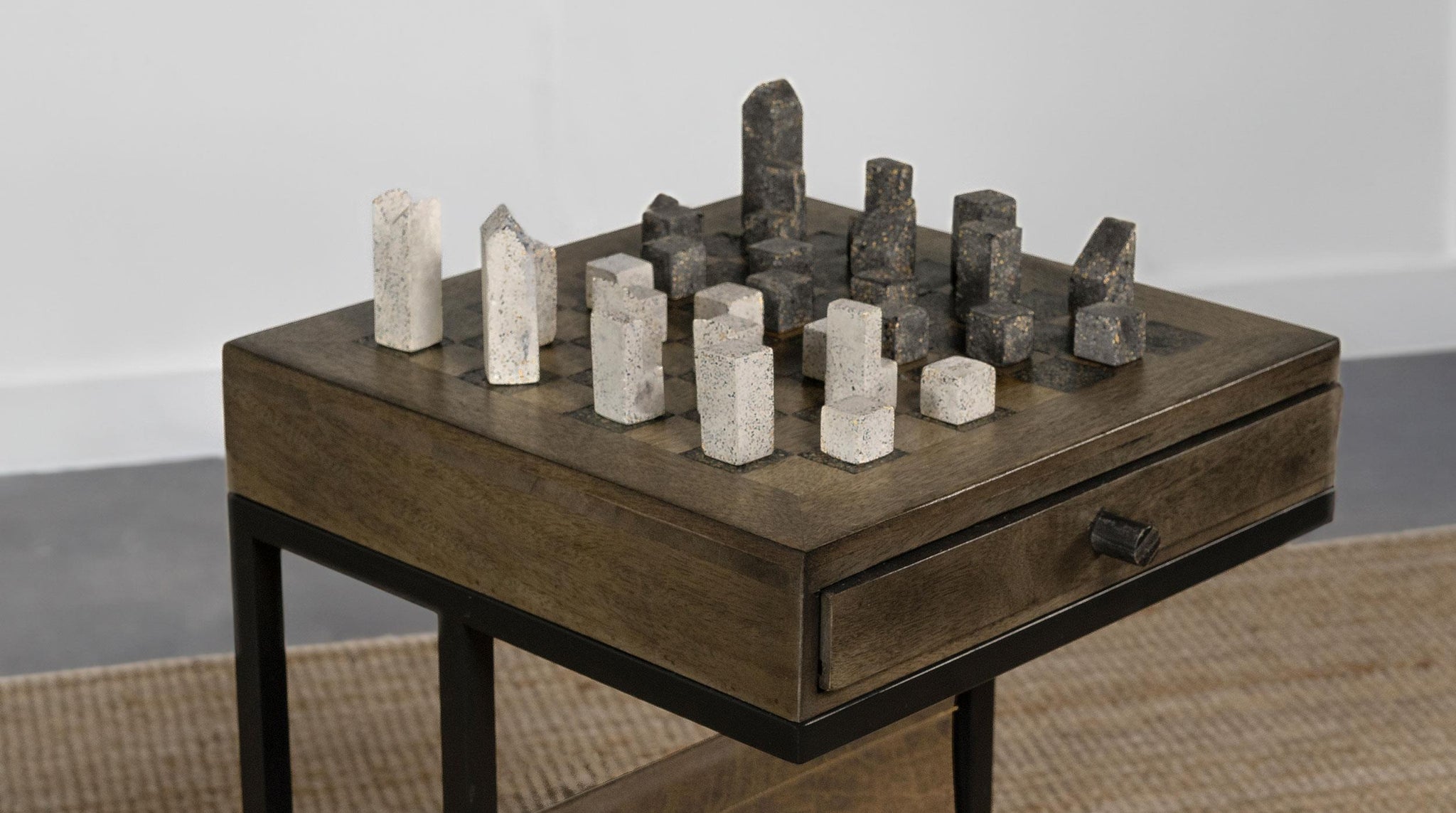 An iconic game with legendary roots folds into the design of this accent table, a perfect choice for adding function as well as entertainment to your living room or game room. Chess is the name of the game as this wood, iron, and leatherette table serves as a side piece with multi-functionality. A carved-in chess board graces the surface of the table’s rustic tobacco finished top unit, which includes a storage drawer to store included Terrazzo game pieces or incidentals. An iron frame offers a bold black finish and an openwork design, reflecting a casual yet tasteful design. Stash books and periodicals in a brown leatherette magazine holder mounted under the tabletop and turn this side table into a multi-purpose center for activity.