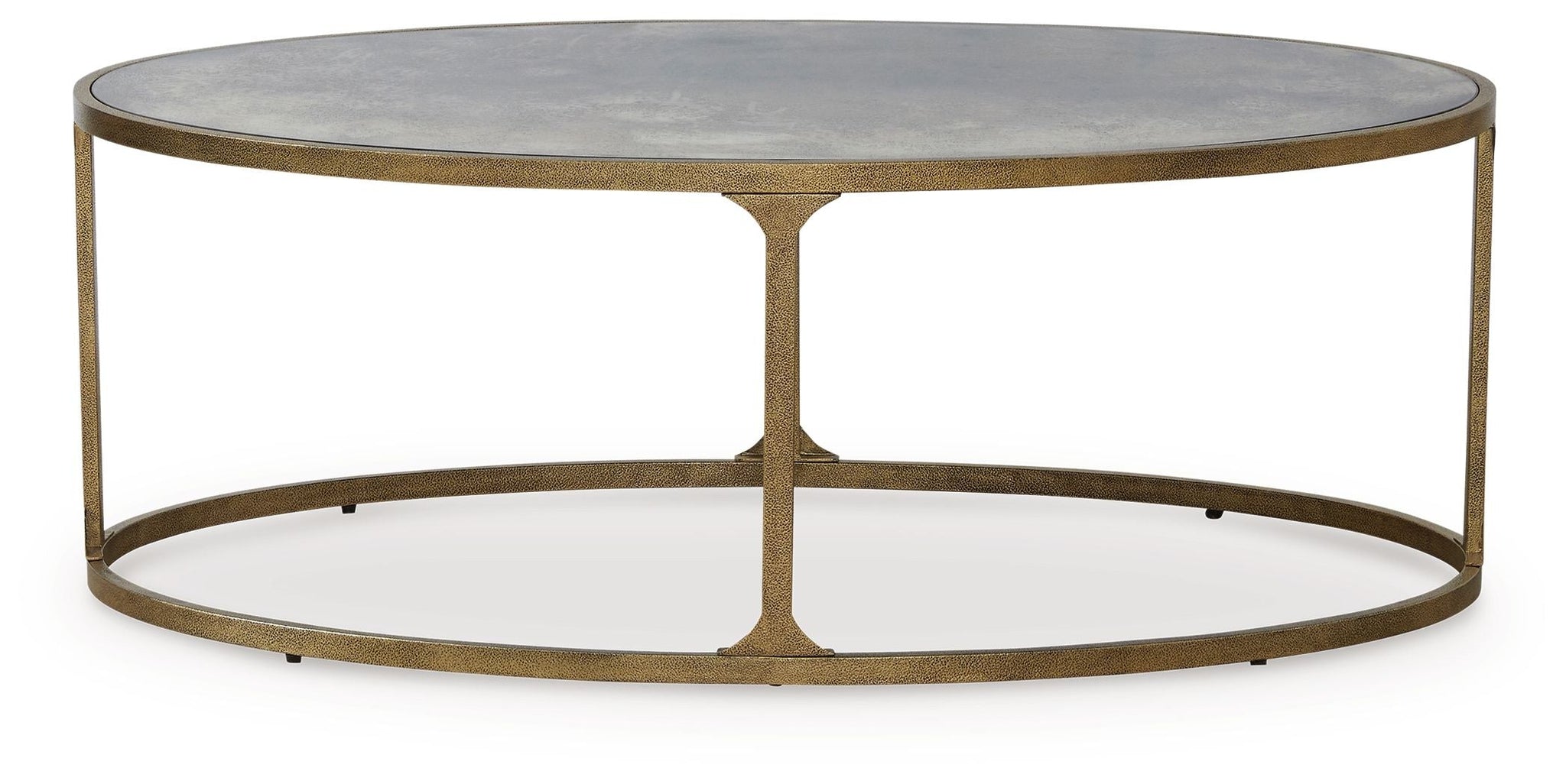 This coffee table blends a traditional feel with contemporary design cues. Antiqued gold texturing on the frame has the look of timeworn, hand-forged metal. A tempered glass top with a faux marble finish provides a refined contrast. Chic when hosting decor or holding entertainment essentials, this table rounds out your living room with transitional flair.