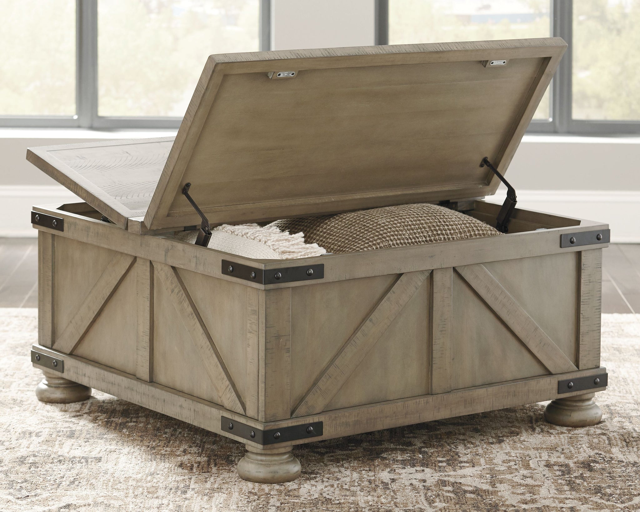Double up on form and function with this square coffee table with storage. Its dual lid tabletop provides easy access to the roomy storage space. Crafted with solid pine wood treated to a weathered gray finish, this generously scaled coffee table is rustic farmhouse living at its best.