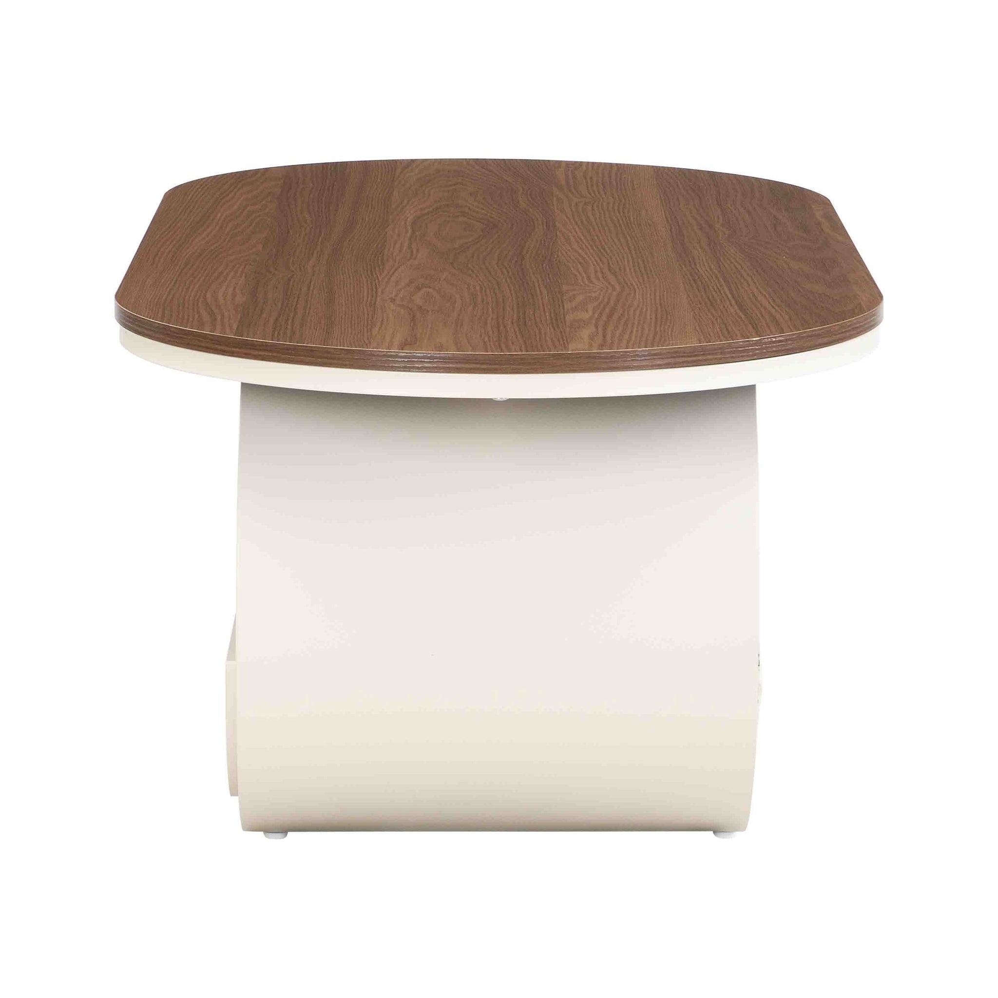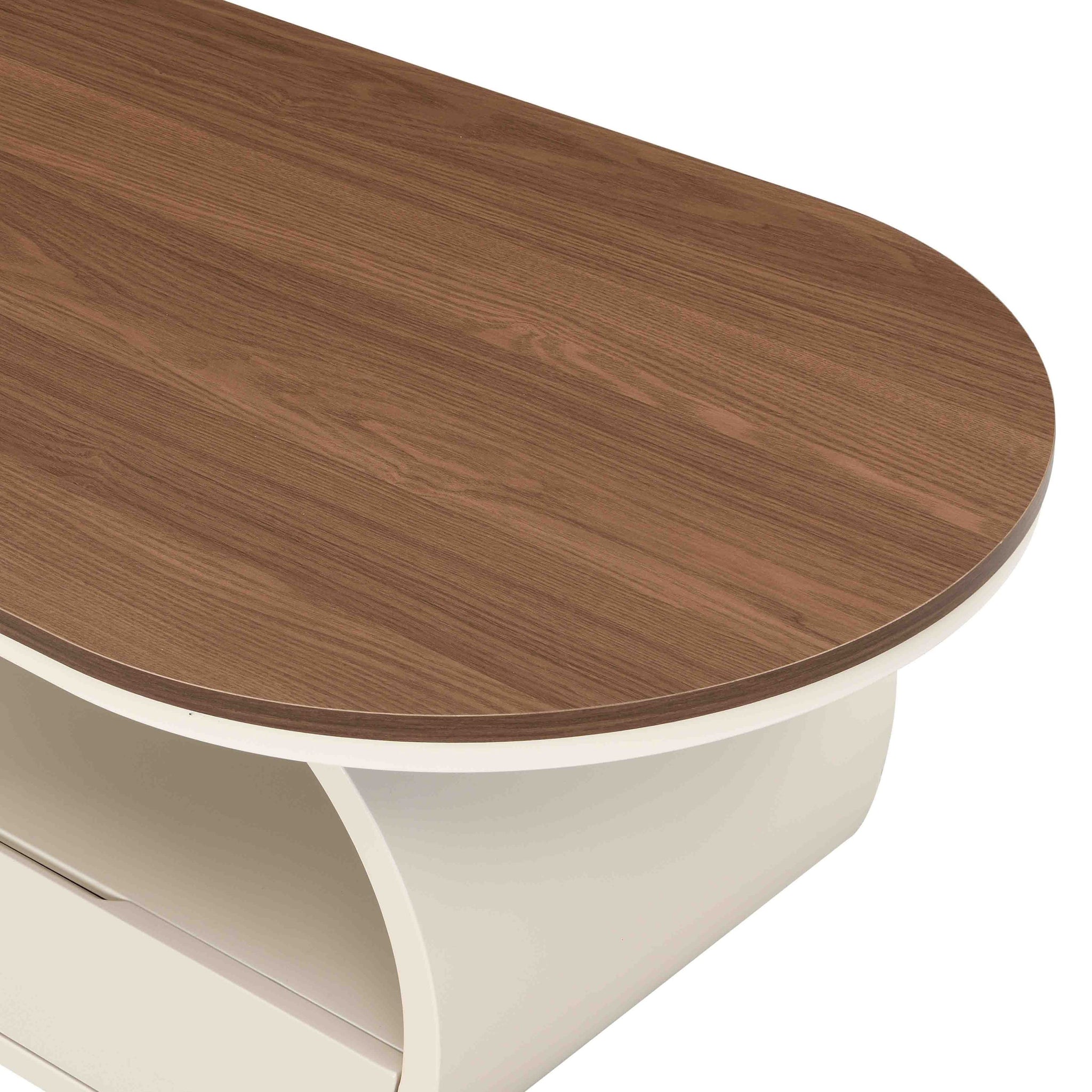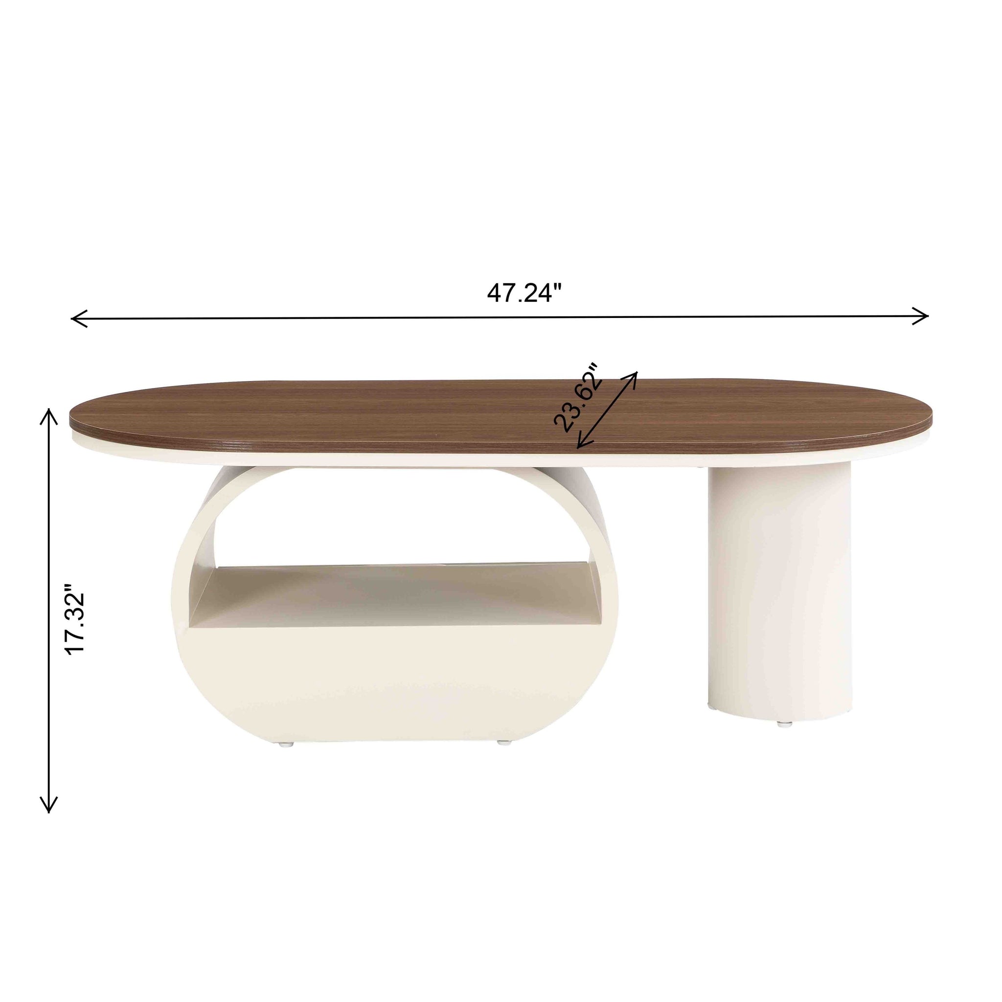 This modern coffee table includes a spacious tabletop and two unique base structures. One of the bases features both a shelf and a drawer, providing convenient storage for remotes, books, coasters, or other small items—keeping your space tidy and organized.