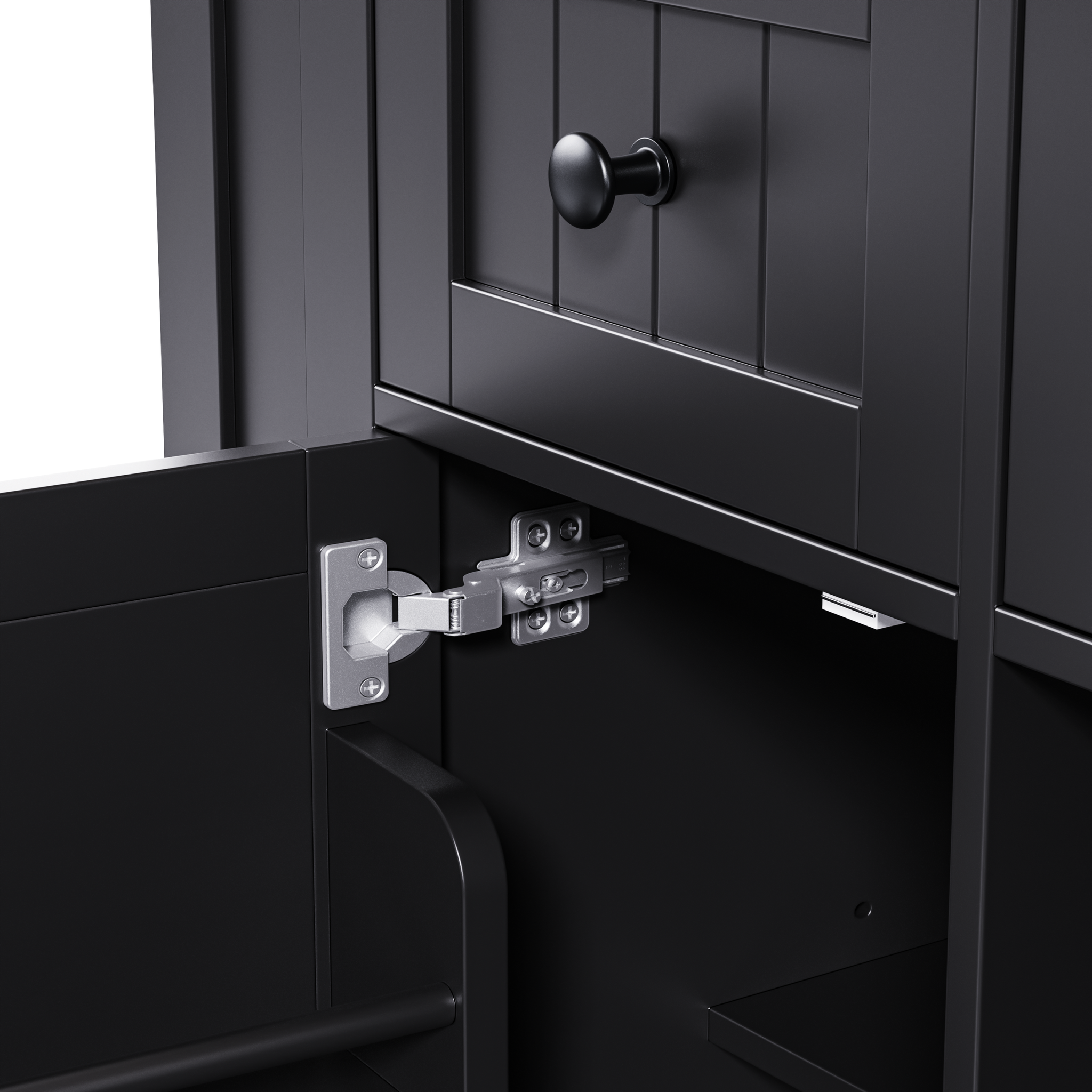The kitchen island fuses classic style, high-end details, and versatile storage. Crafted from CARB Phase II certified MDF boards, its 50''-wide countertop features a smooth, scratch-proof laminate finish table that's great for food prep. The island includes an abundance of storage options: Two cabinets contain a 2-tier door interior storage rack for spice and jars, while 2 side open shelves with bamboo sticks specifically designed for organizing spices, bottles, and wine. Power outlets and towel racks on the same side add another level of functionality.
