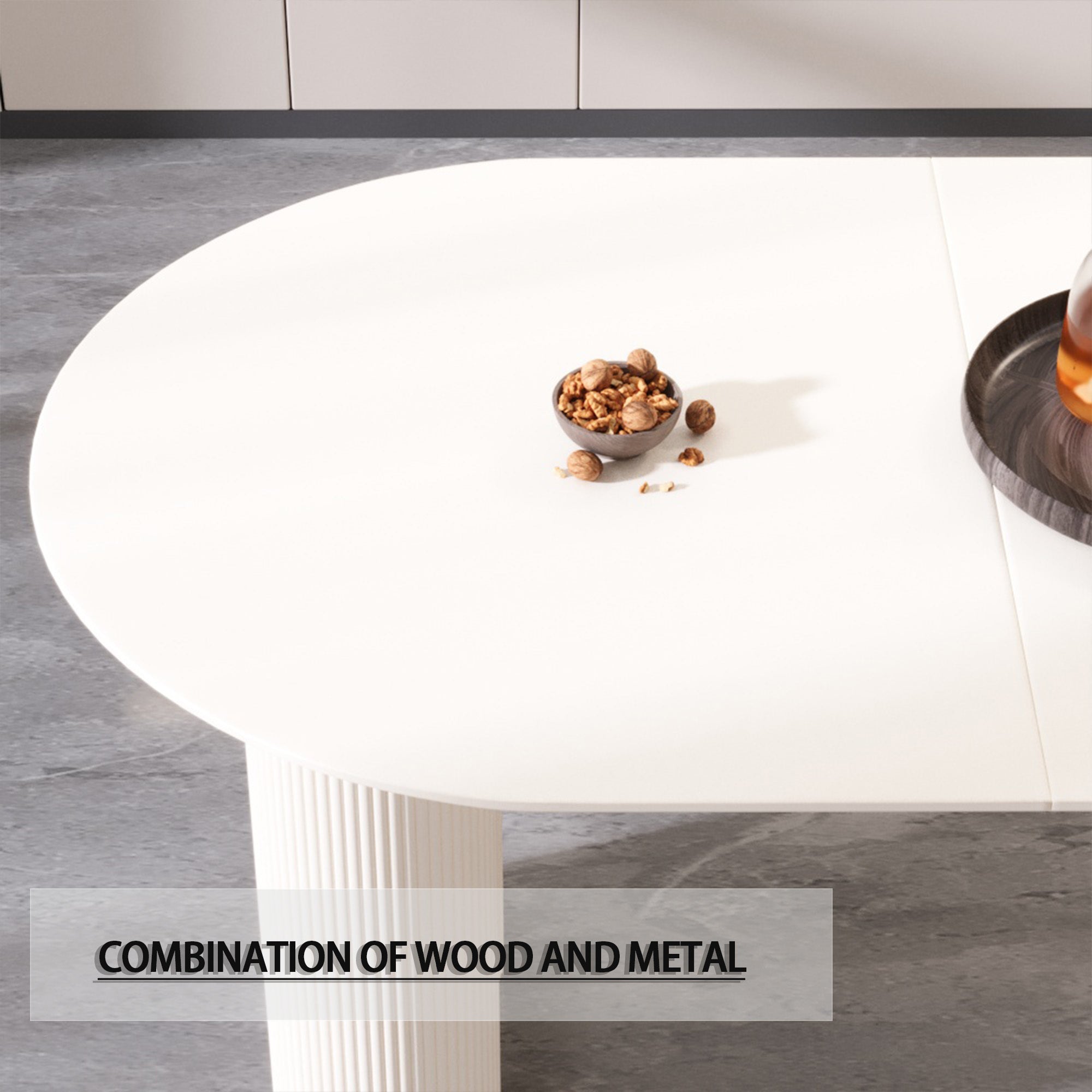 The spacious table accommodates up to 4–8 guests, making it perfect for family dinners, parties, or casual gatherings. Its cream MDF tabletop showcases a refined, wave-leg silhouette that adds an artistic flair to your interior. Paired with ergonomically curved, gray PU chairs, the set combines comfort with elegance.