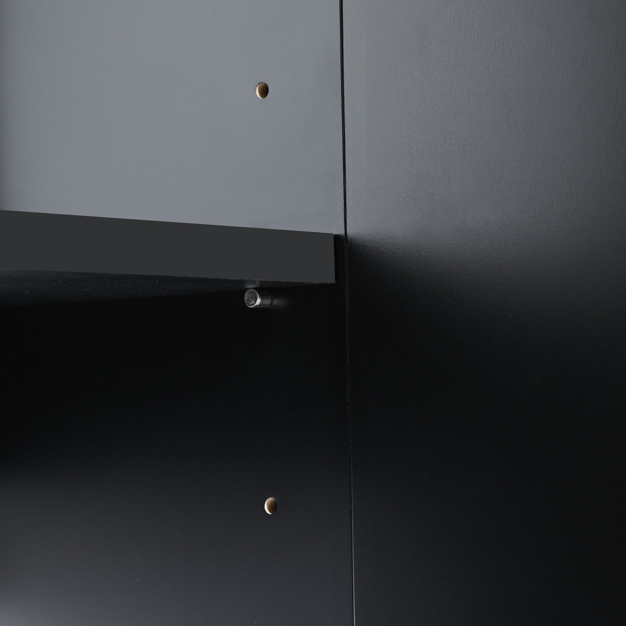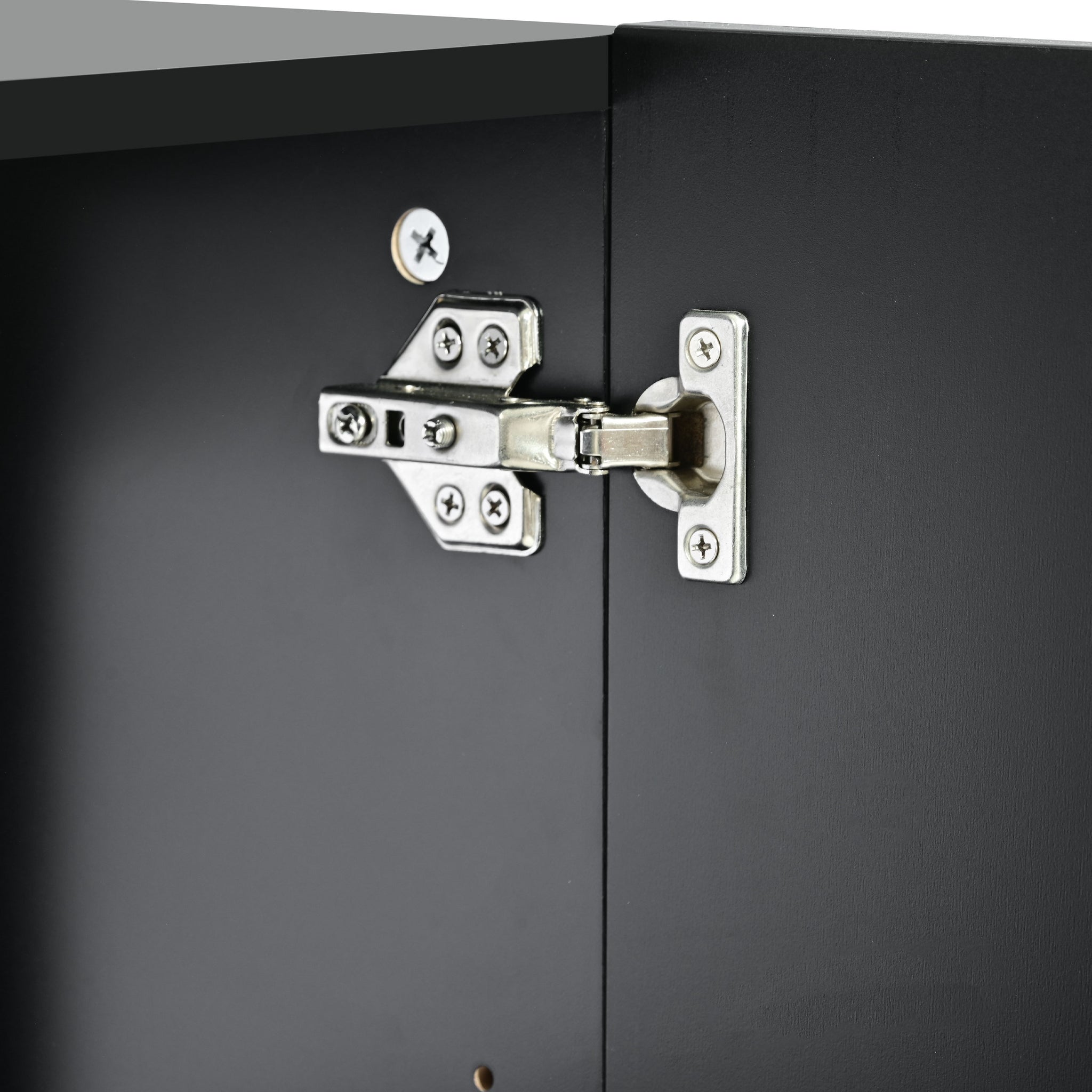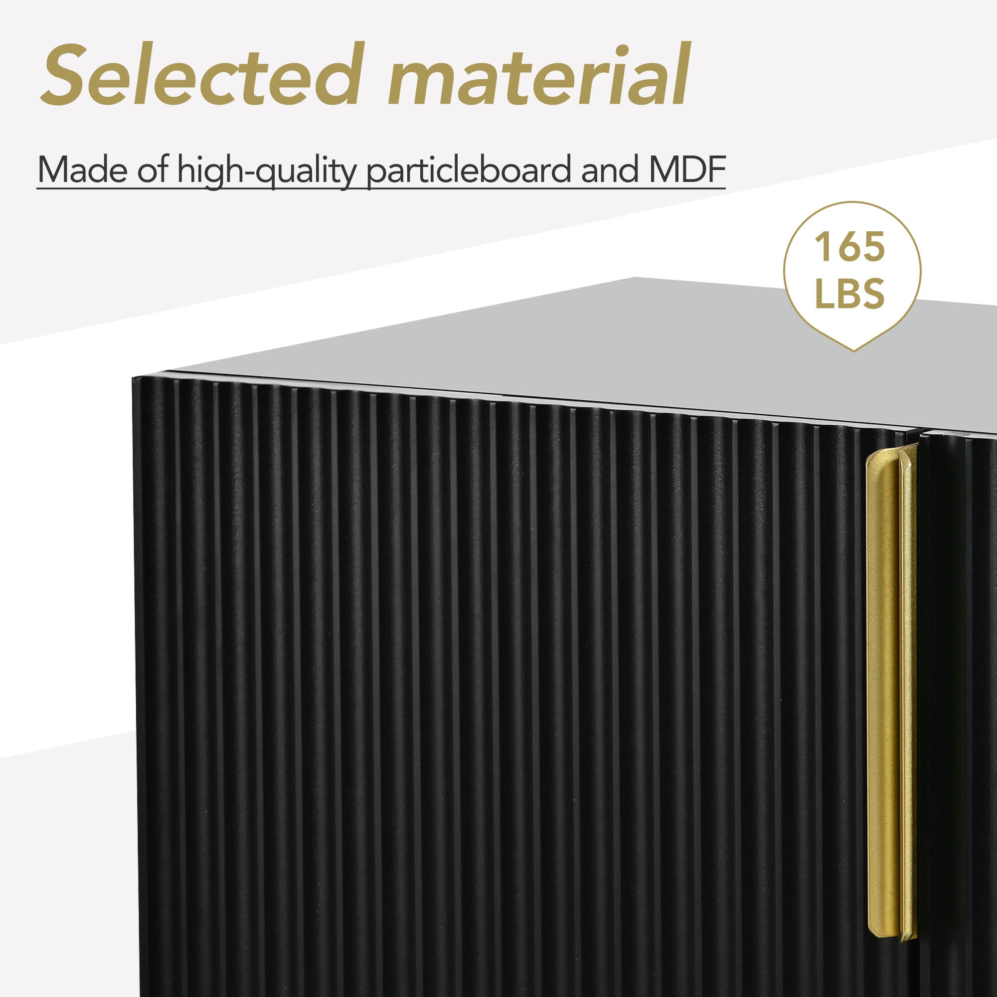 • The sideboard body is made of particleboard, and the tabletop is made of high-quality MDF, which has good load-bearing capacity. Desktop load capacity: 165 lbs. The doors, tabletop and side panels have been painted for a smoother finish. Other panels' surfaces are covered with stickers. The sturdy metal legs ensure good support and stability.