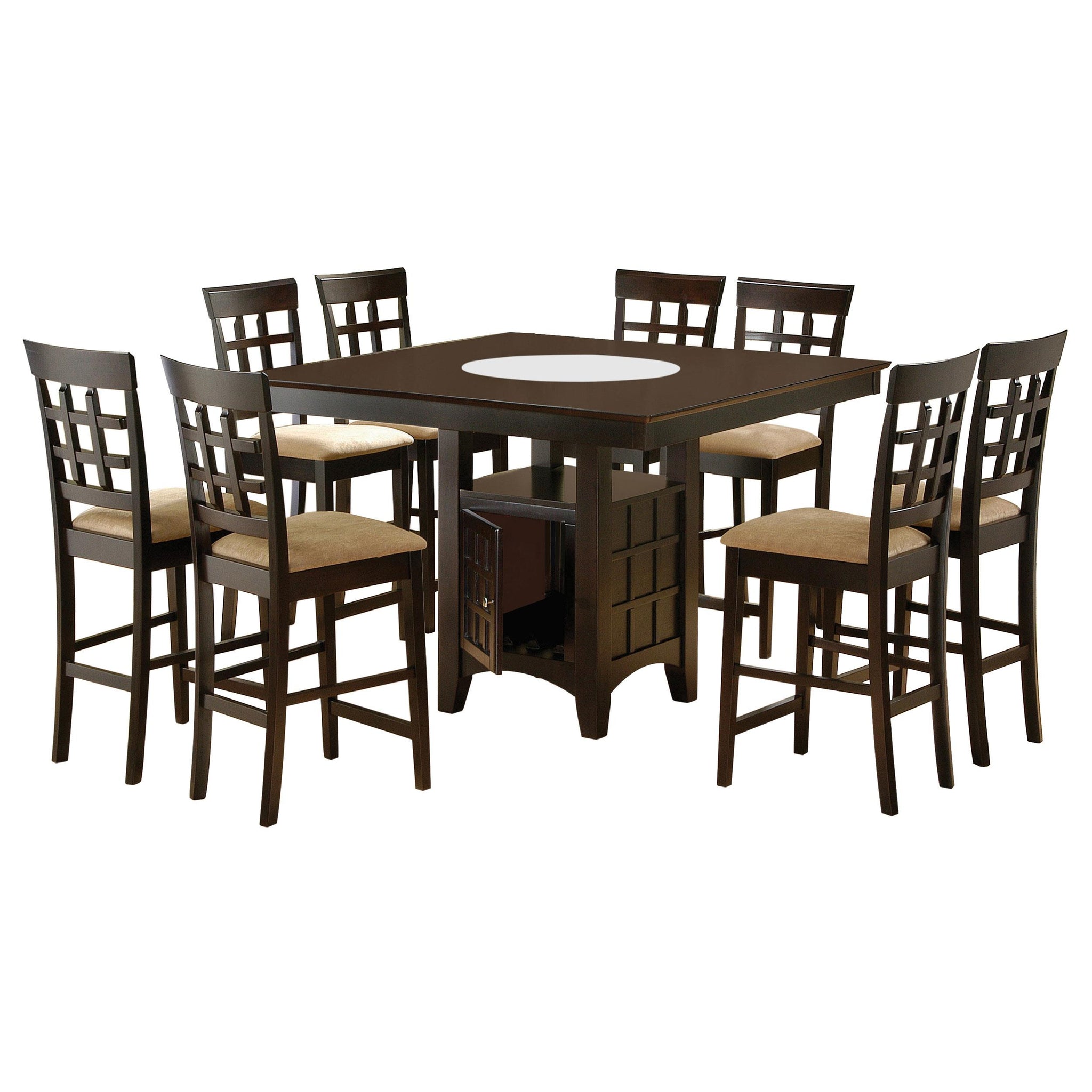 This nine-piece counter height table set comes complete with a spacious square table and eight windowpane style chairs in a deep cappuccino finish. The elegant table features a storage pedestal base that holds wine glasses as well as bottles, and has a table top with a frosted glass Lazy Susan for ultimate serving convenience. Place this comfortable dining set in a transitional dining room for a more casual vibe.