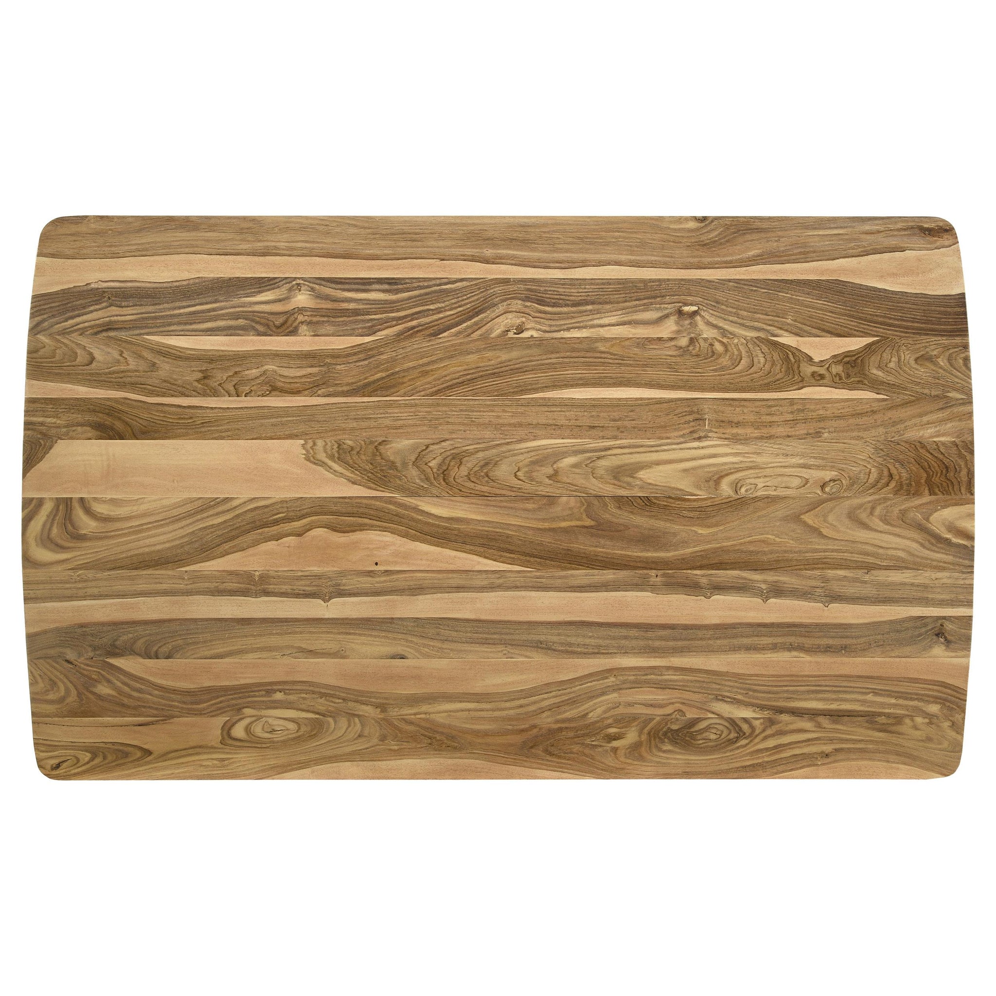 • Natural finish sheesham table with spacious rectangular top and tapered, rounded legs, dark apron with geometric design detail for an exotic effect
