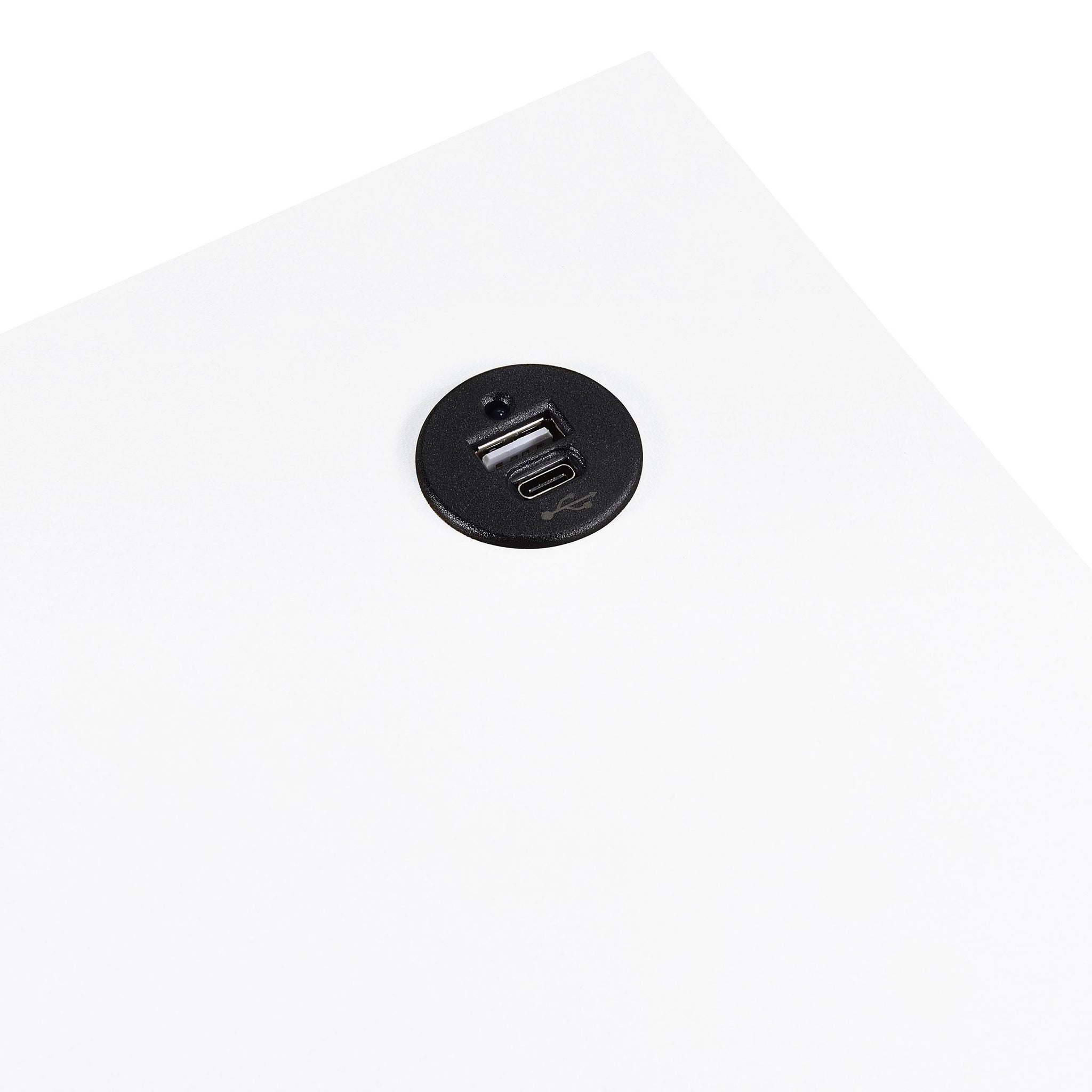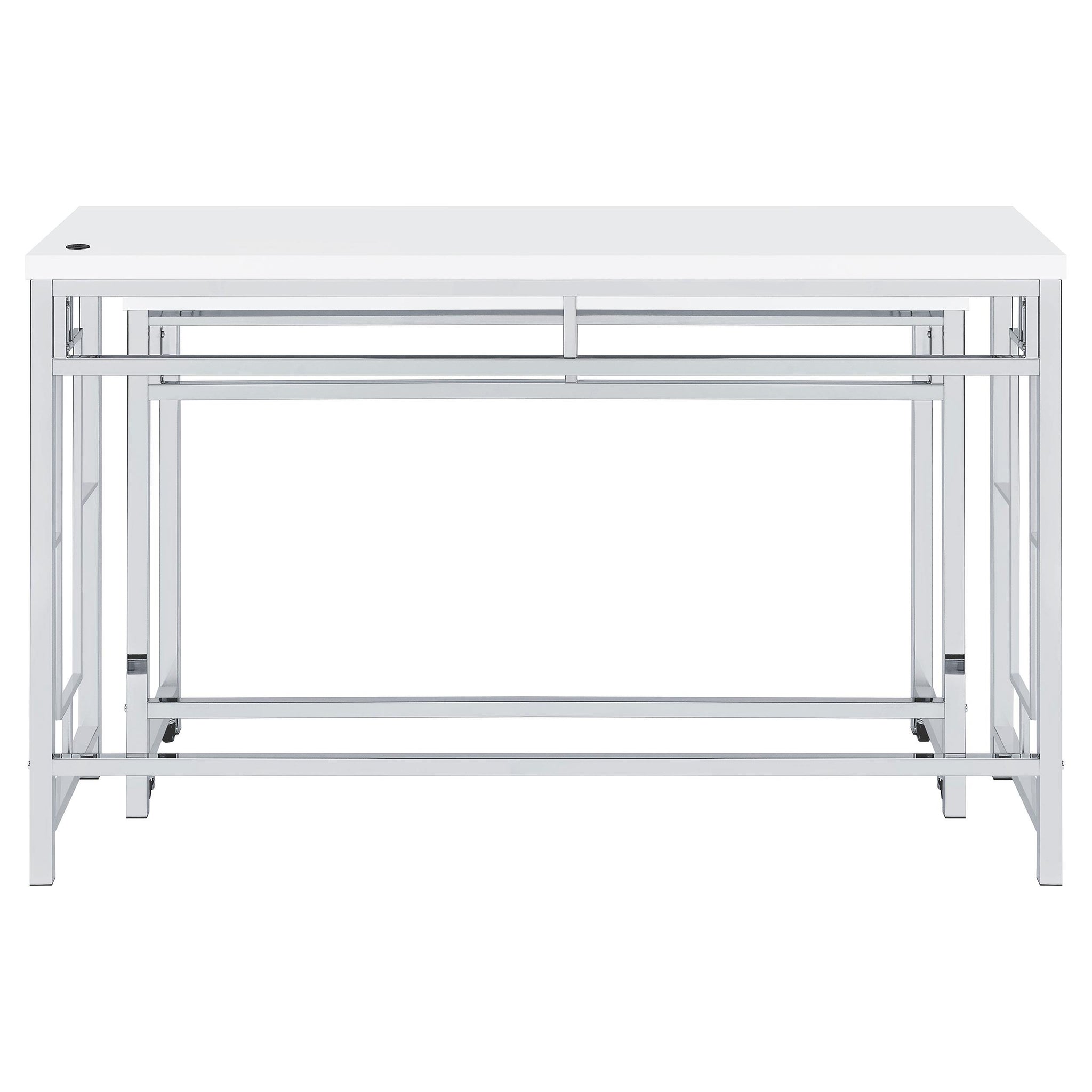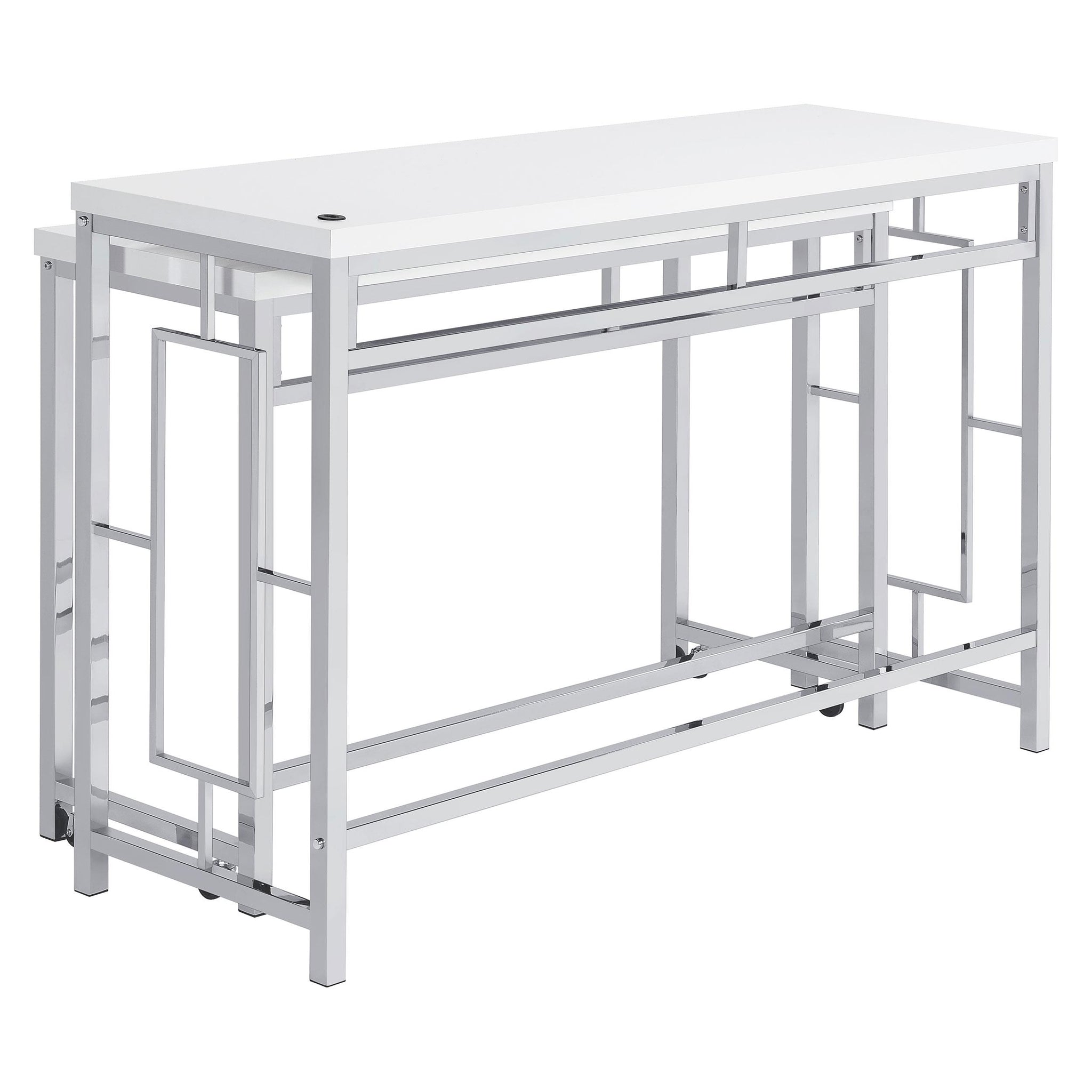 Youll fall in love with the versatility and impeccable styling of a contemporary four-piece counter height dining table set that includes two nesting tables and two backless stools. Whether youre dining or working from home, the set is designed to impress, with a larger table and a smaller table on wheels that tucks underneath, creates a waterfall effect, or can be positioned in an L-shape for working from home. Its crisp white and silver finish combination highlights artistic design. The set is complete with open sides and stool bases accentuated with floating frames to bring Deco character. The large tabletop is equipped with a USB port perfect for your phone.