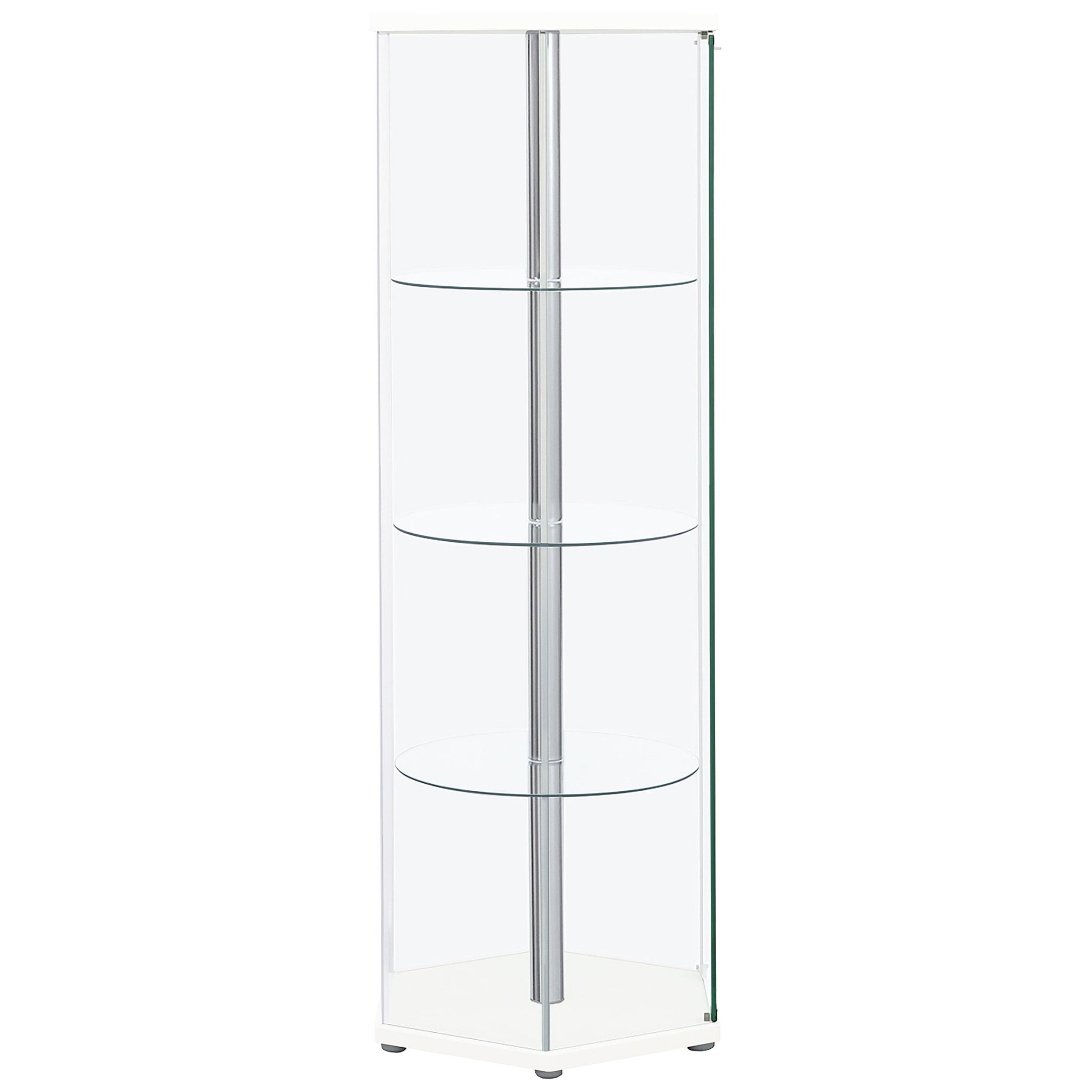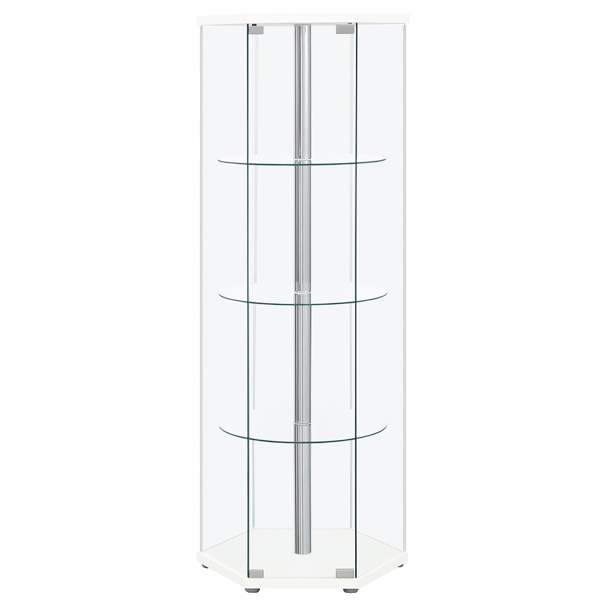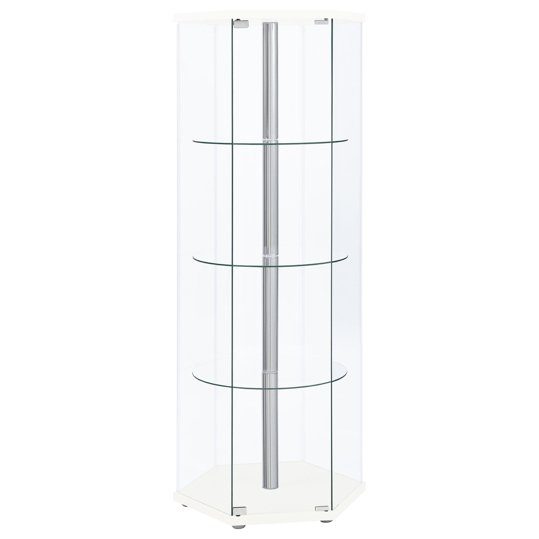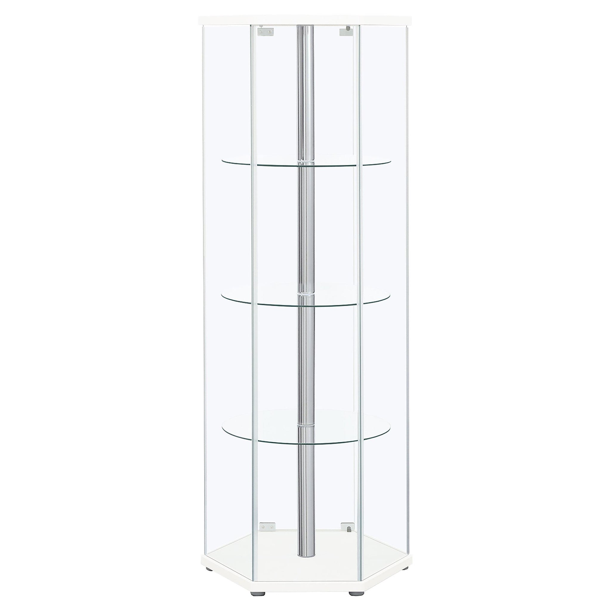 A fetching silhouette blends modern architecture with a fashionable finish. This curio cabinet illustrates the benefit of geometric design. A hexagonal shape offers an enticing look in a contemporary space. Finished in radiant white, it delivers fresh energy. Three round glass shelves provide ample space to store essentials.