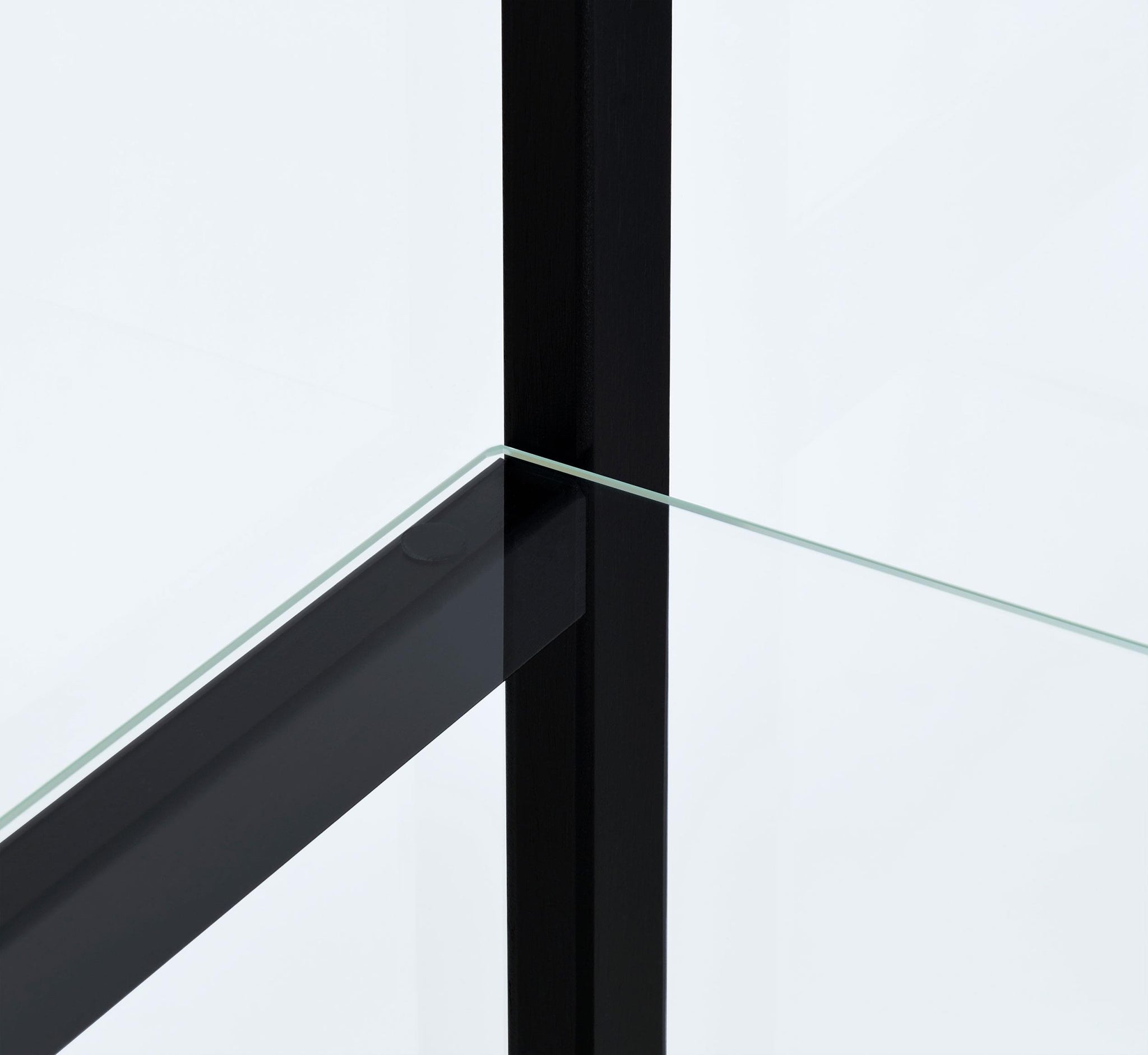 Ideal for a more compact space, this curio cabinet offers fresh and inspiring style. Simple linear design blends a slender black frame with tempered glass shelving. Push-to-open glass doors offer easy access to its interior space. This curio cabinet is an ideal venue for showcasing treasured decor and artwork. Add it to a tasteful seating ensemble or position it as an eye-catching standalone piece.
