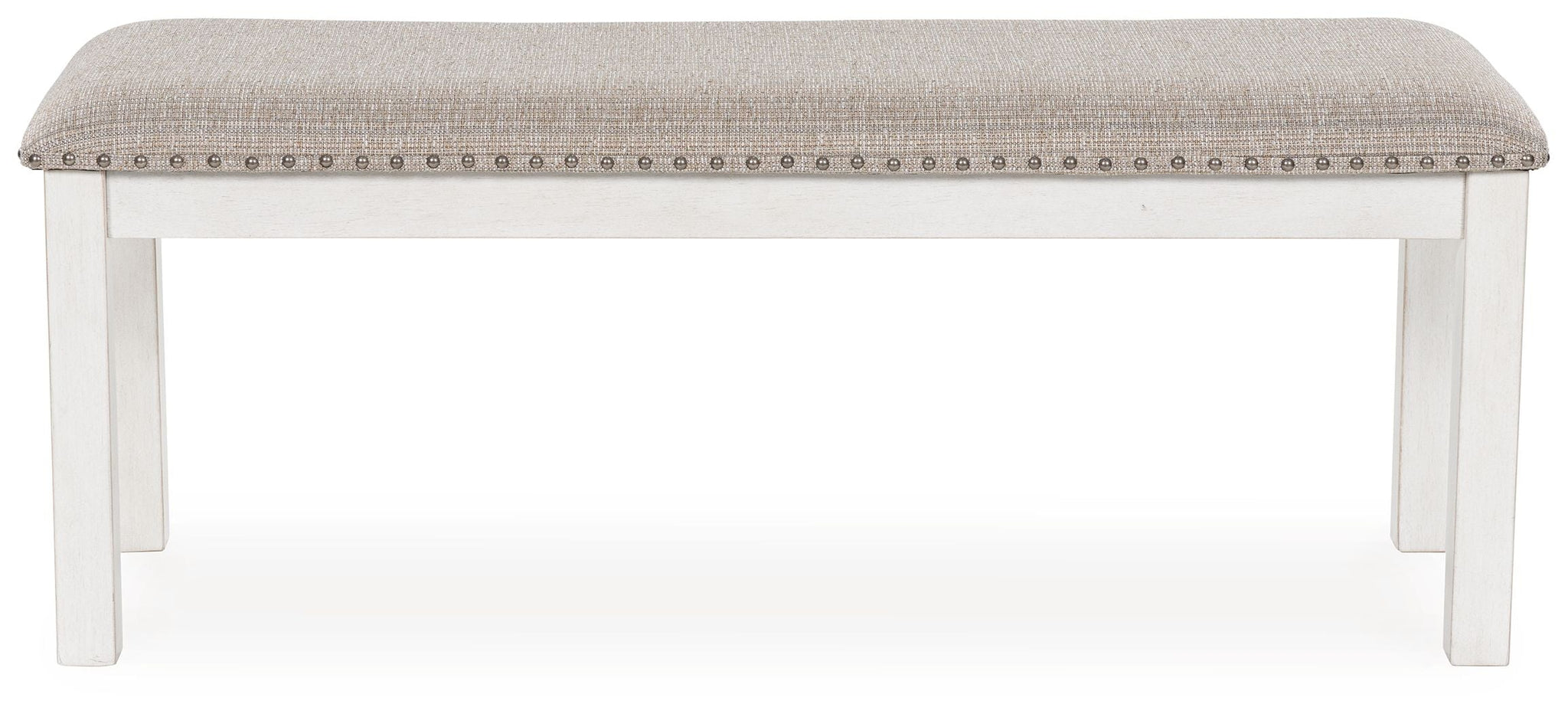 The Robbinsdale dining bench is sure to impress come mealtime. With its antiqued white finish and light gray upholstery with nailhead trim, modern farmhouse-style dining has never been so fashionable. All thats missing is you and your family.