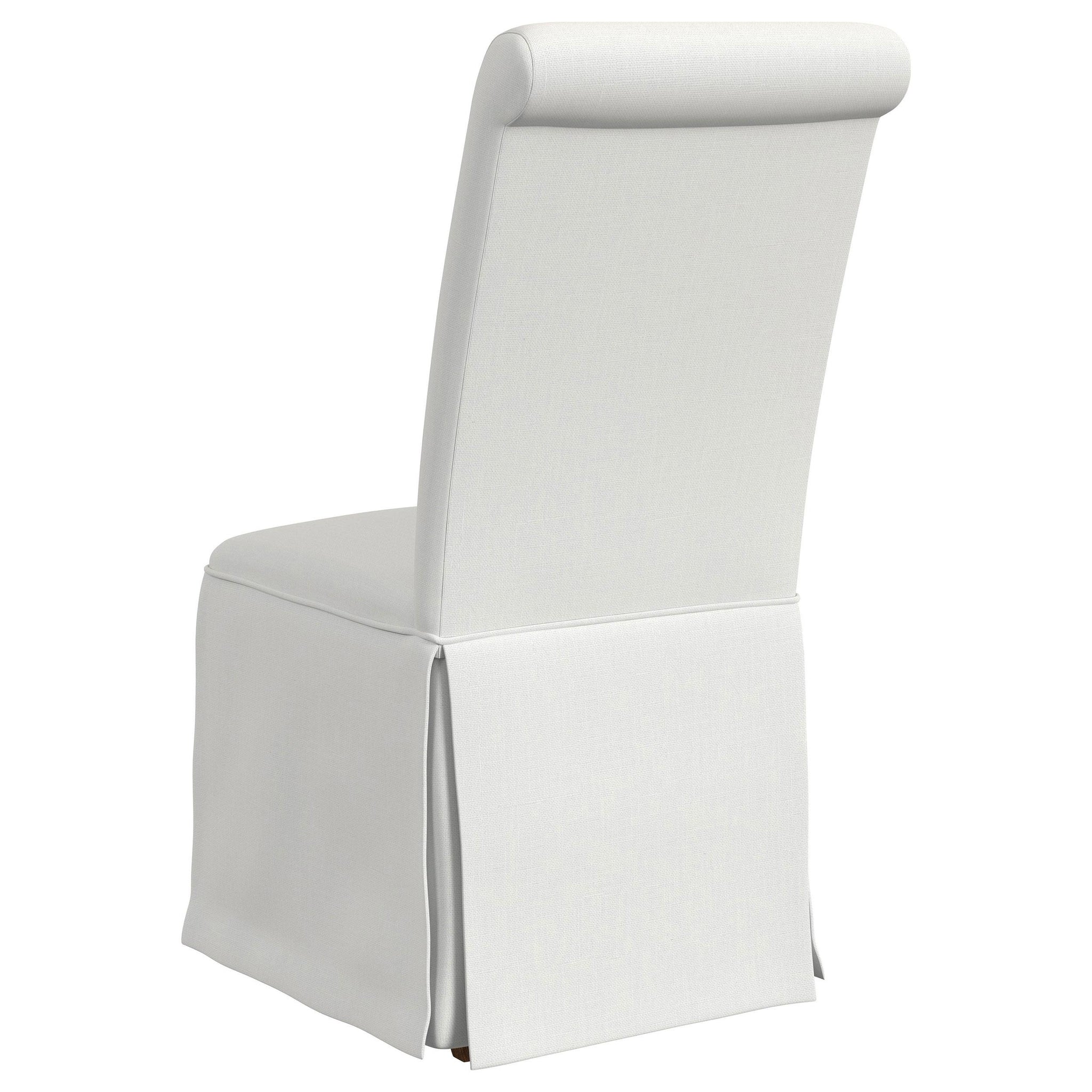 Put a stylish, somewhat formal spin on your dining room decor with a set of two classic parson chairs. Each features a tall back with an armless profile for impeccable comfort and elegance. The chair features plush foam padding, complete with neutral upholstery for a fresh, inviting presence at your dining table. The chairs showcase fully skirted silhouette, adding a touch of flowing movement. Tall, rolled backs ensure supportive seating for friends and family, wonderful for daily and occasional use.