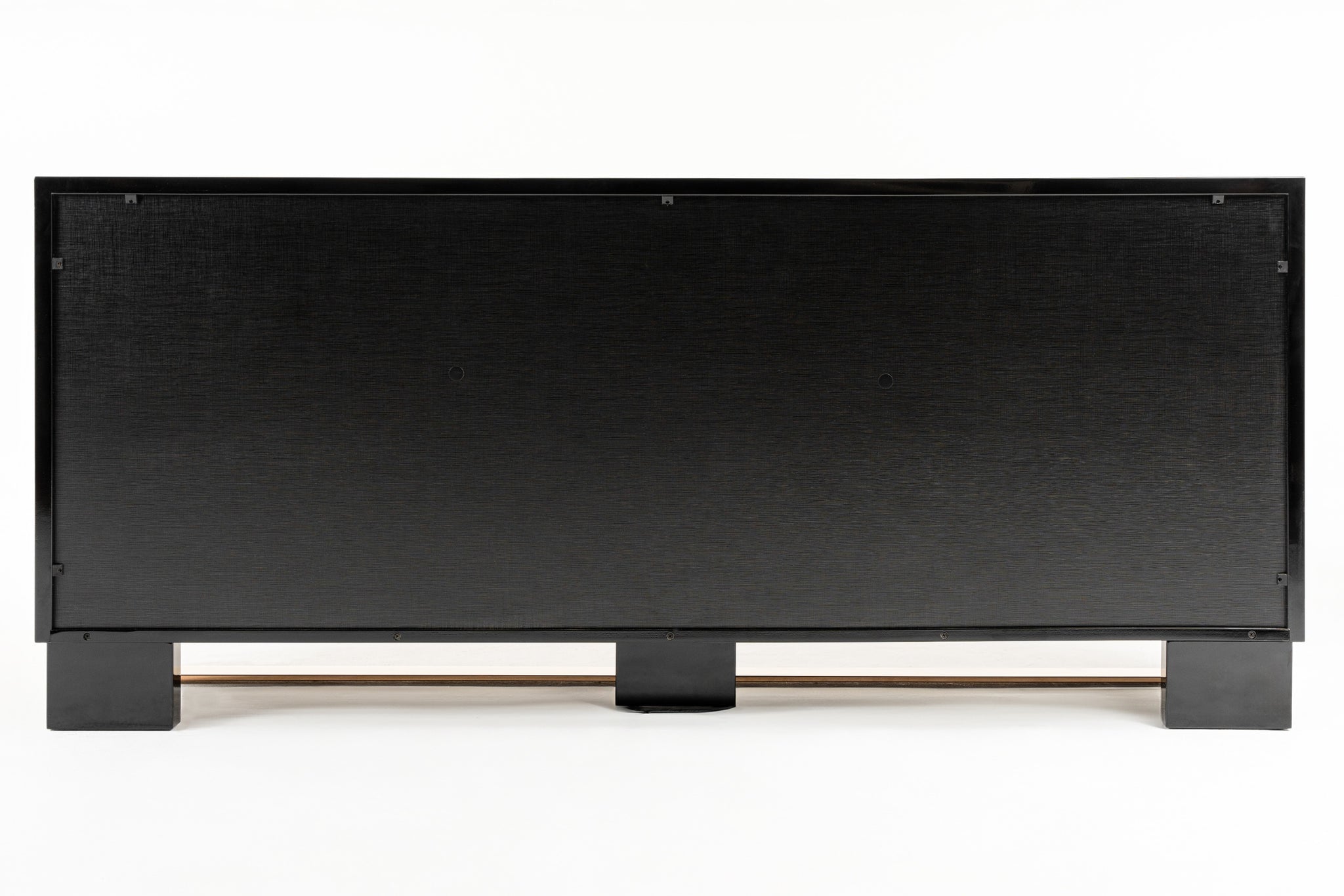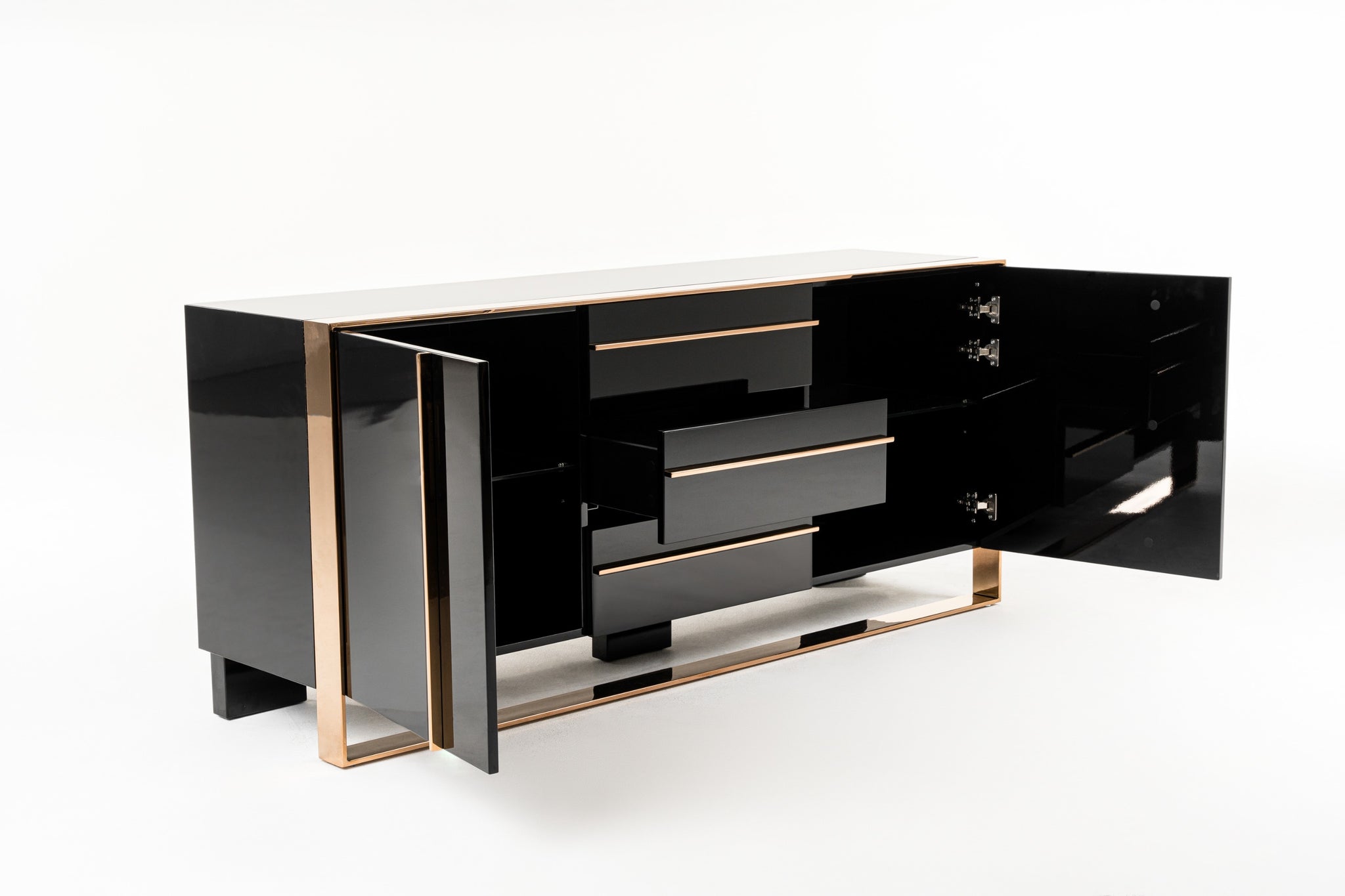With its deep gloss finish and practical storage, this Cartier buffet is the perfect addition to any home. Featuring three drawers and two easy-opening cupboards with shelves, the buffet provides substantial storage as well as good looks. The gloss black finish contrasts nicely with the brushed rose gold stainless steel frame and handle, providing an elegant look that will blend with any décor. Delivered fully assembled and ready to go, this wonderful buffet will be a stylish addition to your home.