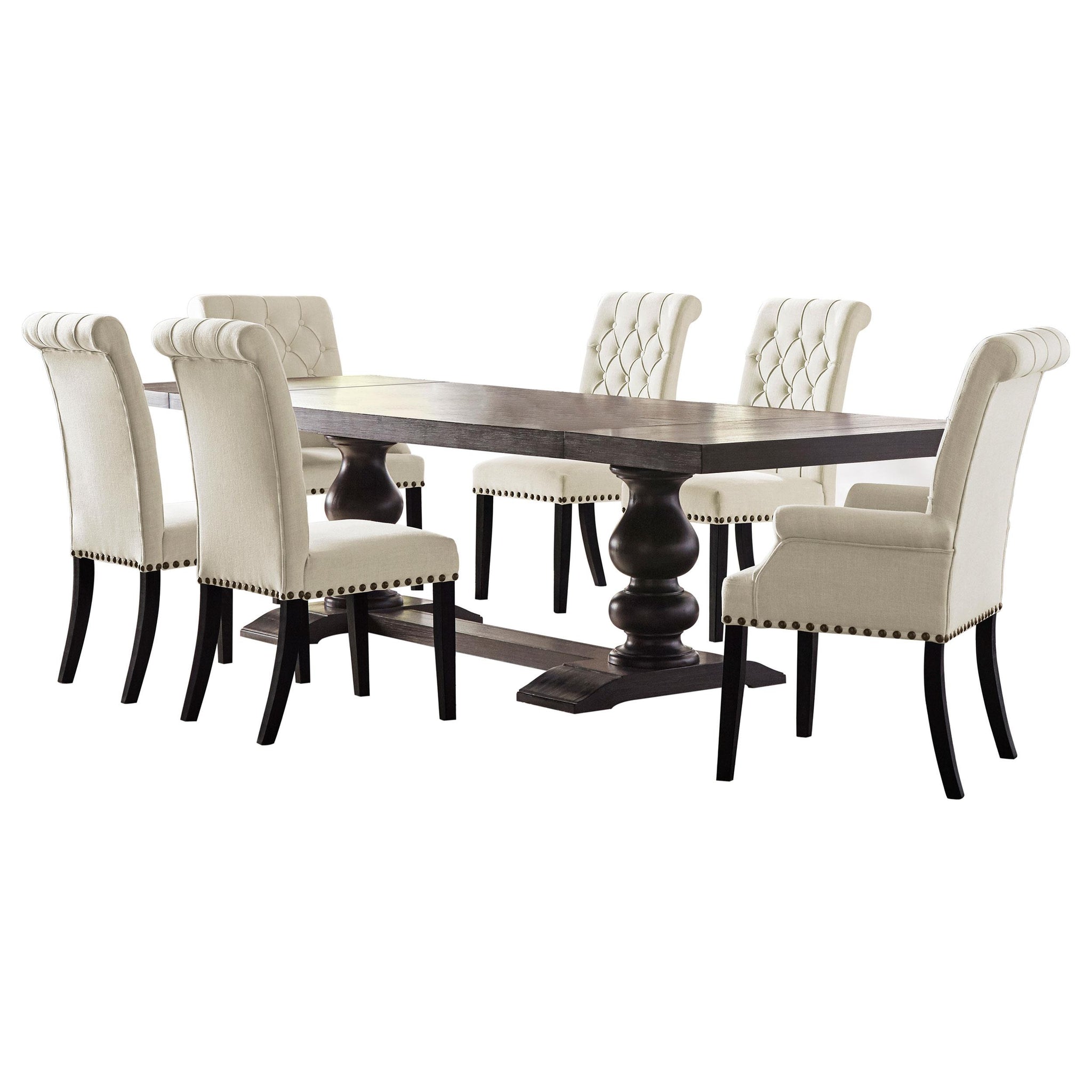 An exceptional dining set is inspired by European decor for a gorgeous dining space. The expansive rectangular tabletop is supported by a dual pedestal base with a stunning silhouette. Find upholstered dining chairs with a rolled backrest design for a traditional chest.  The chairs are further enhanced with nailhead trim along with the frame. Supported on tapered legs, the dining seats are bound to provide you with a delightful dining experience.