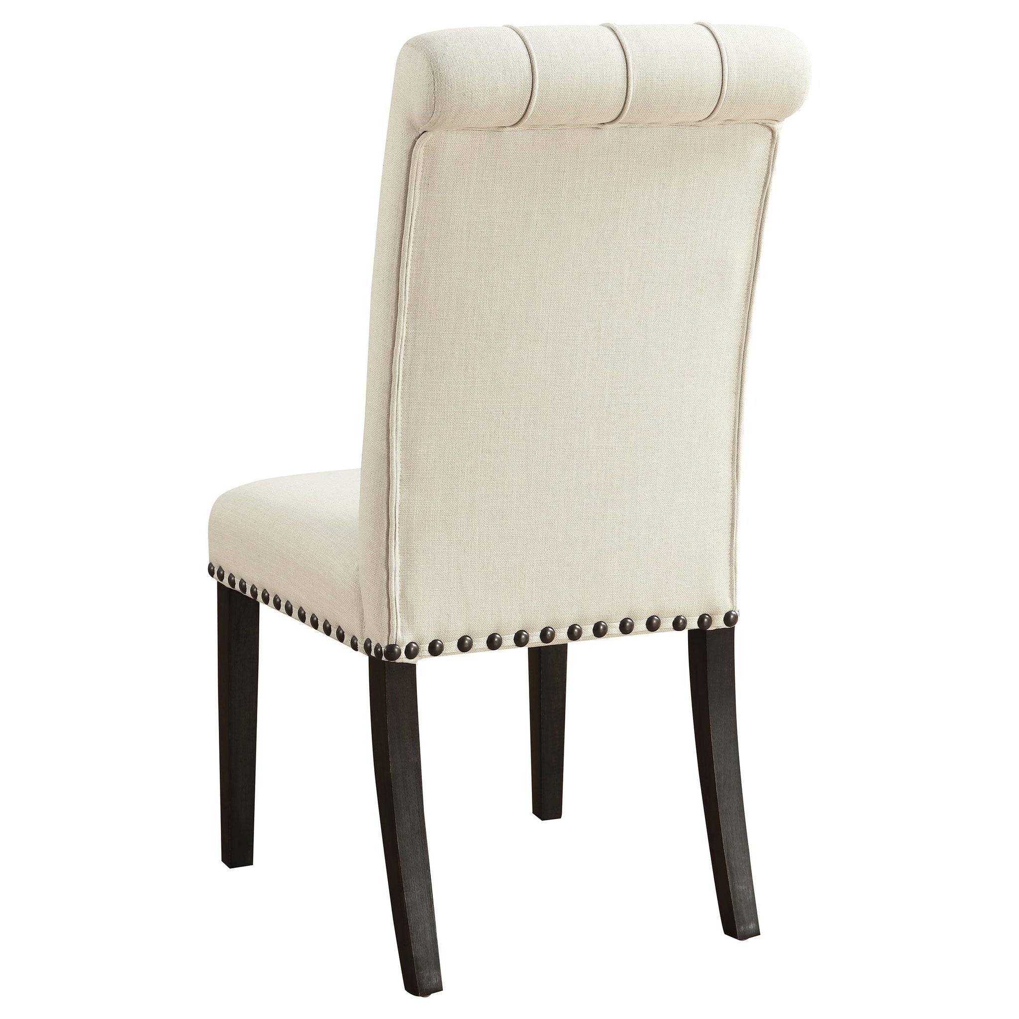 • Beige fabric chairs feature rolled backs and classic nailhead trim