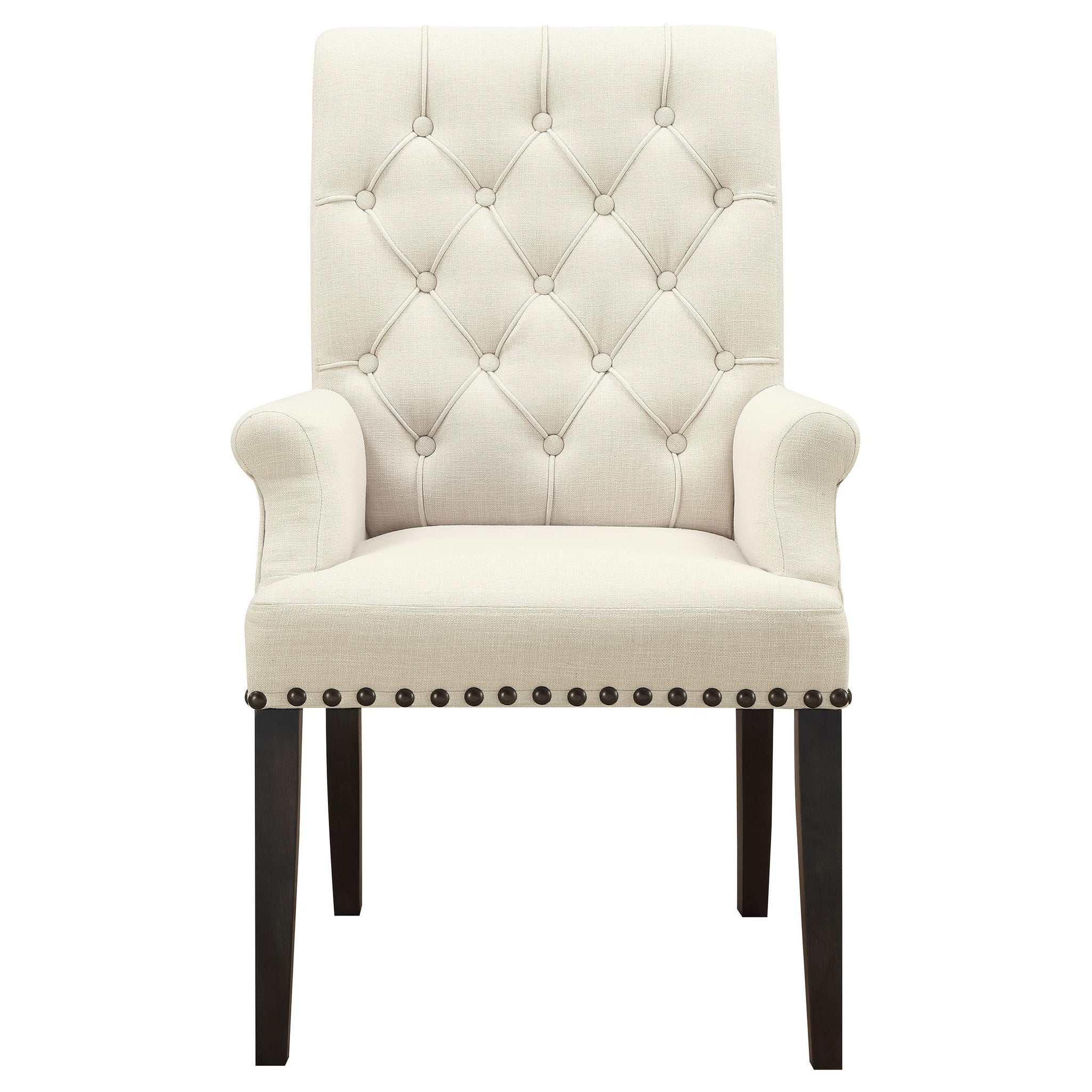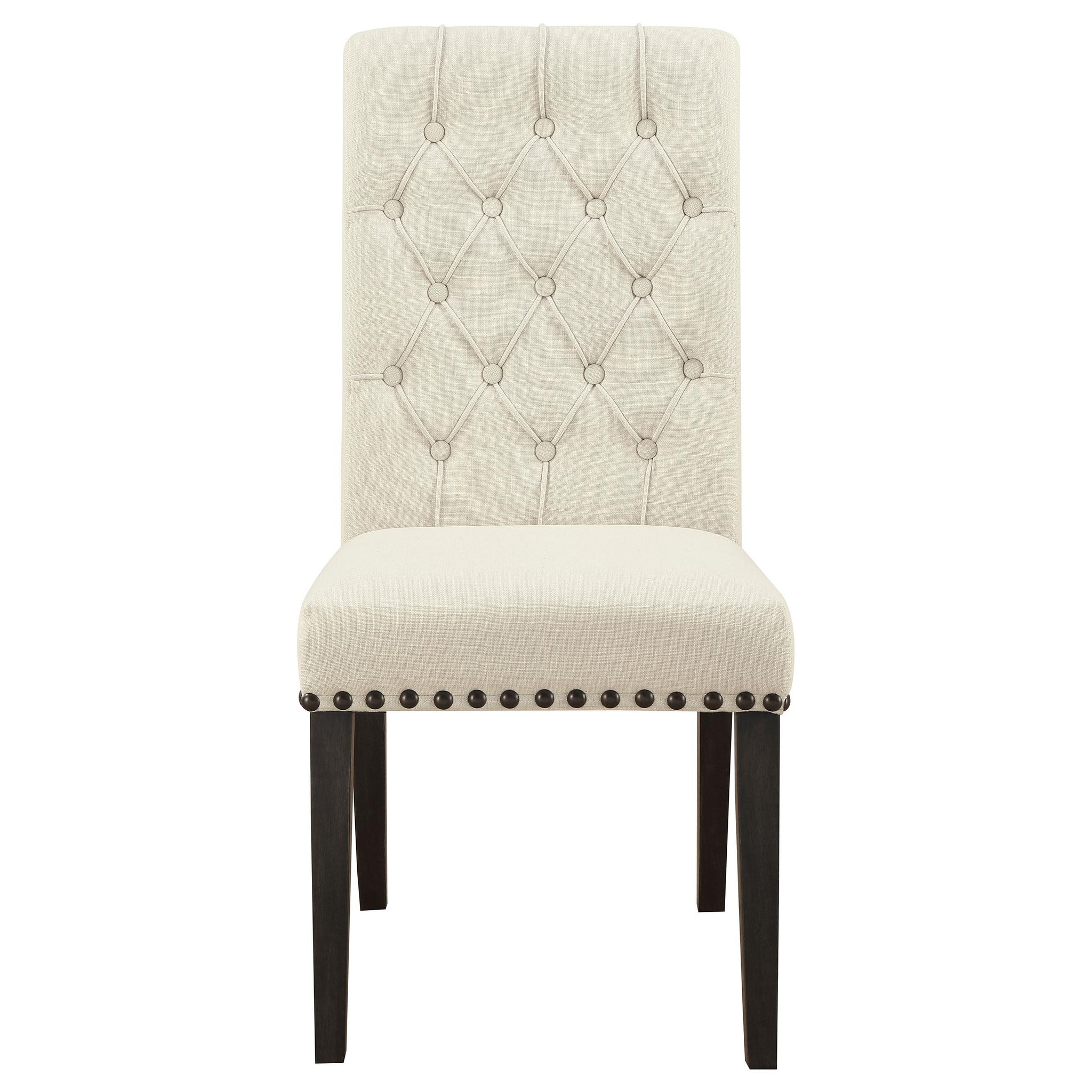- Beige fabric chairs with button-tufted backs and decorative trim details