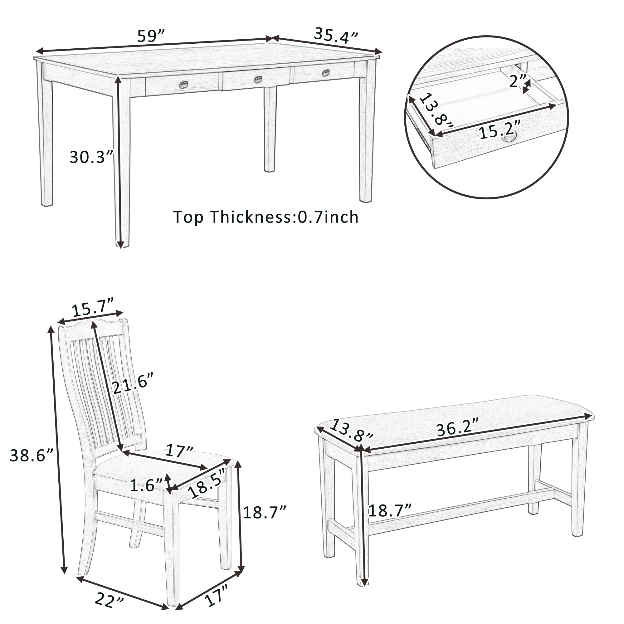 • Dining Bench: 36.2"W x 13.8"D x 18.7"H