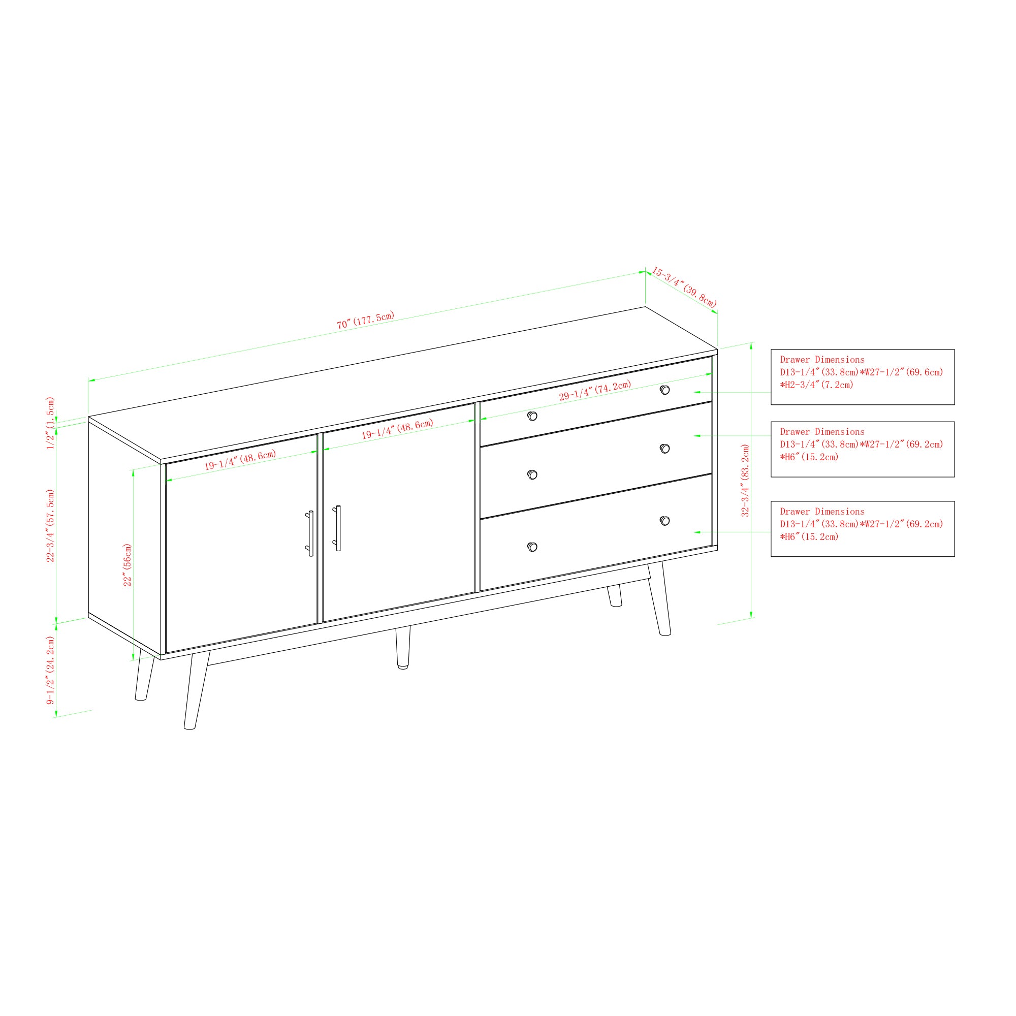 Introducing our sideboard, a versatile storage solution designed to meet your needs with its array of features. Equipped with three drawers boasting telescoping metal drawer glides and two doors featuring soft-close hinges, it offers ample storage space for various items. The inclusion of two adjustable shelves allows for customizable storage arrangements tailored to your preferences. Supported by a solid wood base with an adjustable center foot, this sideboard ensures stability while accommodating TVs up to 80 inches, making it an ideal addition to any living or entertainment room.