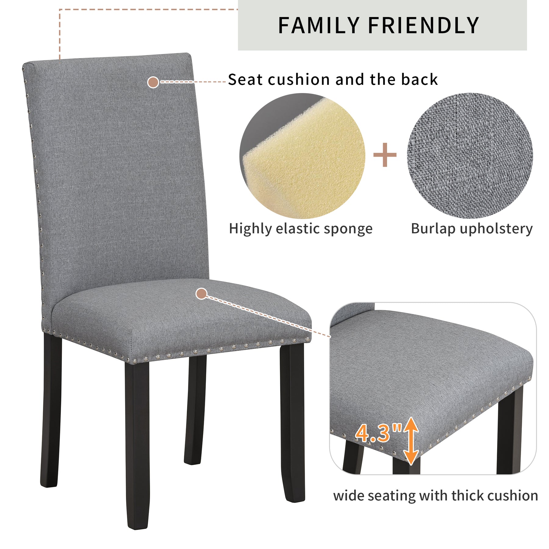 Family Friendly: Both the seat cushion and the back of this kitchen table and chairs set of 4 are padded in highly elastic sponge and tightly woven burlap upholstery. 4.3' thicken cushion for upgraded comfort. Each chair comes complete with wide seating, the seats are formulated for easy spot cleaning with the wipe of a damp cloth.