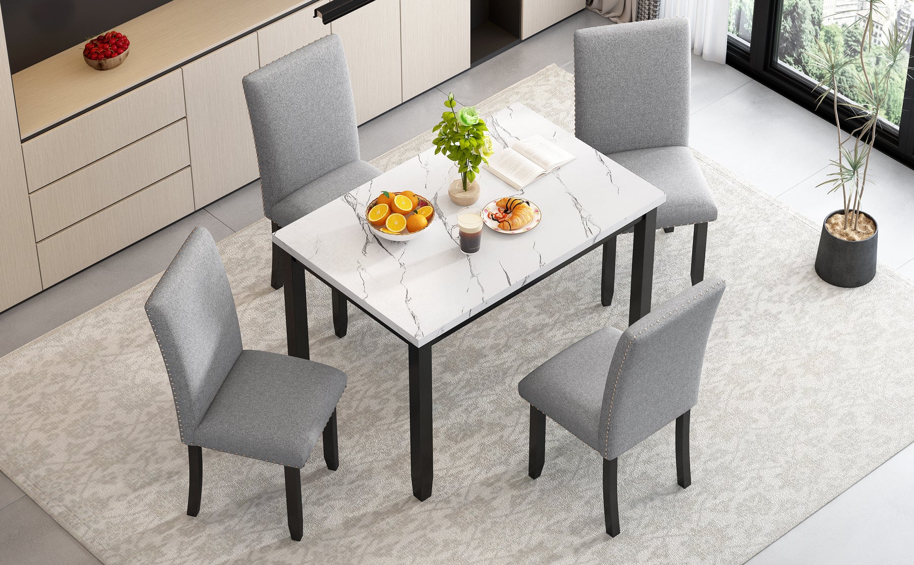5 Piece Kitchen Dining Table Set: This dining table set for 4 includes a table and four matching chairs for the whole family to enjoy. The table and chair legs are fitted with rubber protective foot pads on that can protect your floor from scratches, while ensuring the kitchen table and chairs set of 4 maintain their stability.