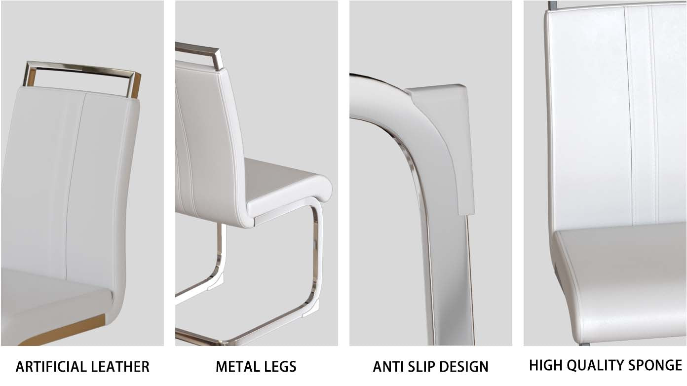 The rectangular MDF table features a stain-resistant, easy-to-clean surface and thick striped legs for added stability and style. Paired with white faux leather chairs featuring sleek C-shaped silver-plated bases, the set brings a modern, fashion-forward touch to any dining room. Scratch-resistant plastic feet protect your floors while enhancing durability.