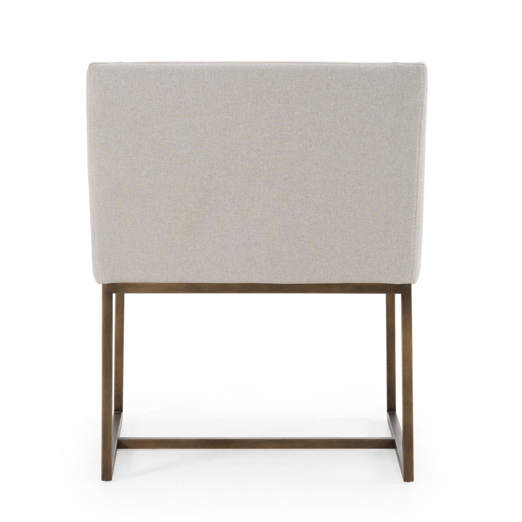 The Elijah Dining Chair is a beautiful modern contemporary piece of furniture. The squared slope arms match height perfectly with the low back of the chair, creating a fully embracing silhouette. Upholstered in a soft grey fabric, this chair is comfortable and stylish. The antique brass finished legs have modern lines and contrast the soft fabric. These versatile chairs can be paired with any style and look right at home.