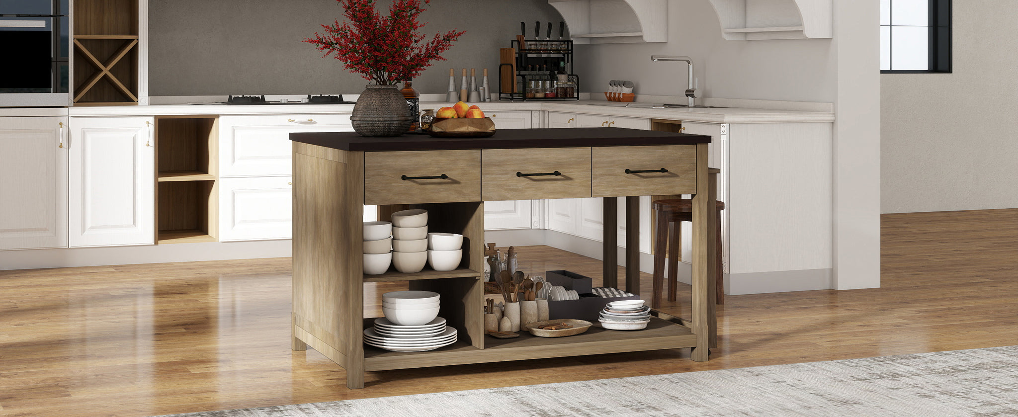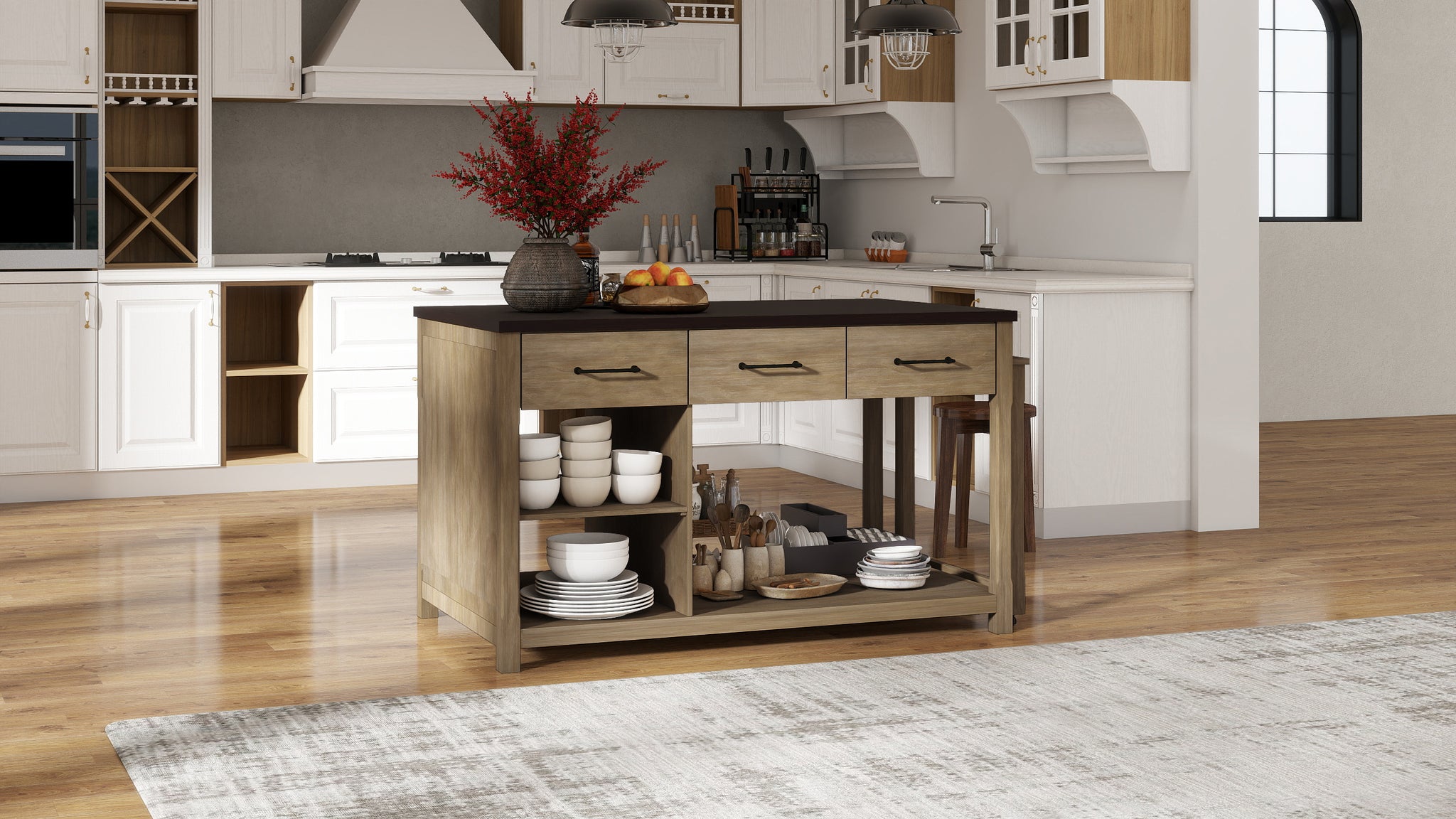 - Durable and Practical Storage: Crafted from high-quality wood, this kitchen island offers exceptional durability and weight-bearing capacity, ensuring long-lasting use. Its 3 big drawers and open shelves provide ample storage for kitchen essentials, from utensils to small appliances. The sturdy construction and customizable storage options make it both practical and reliable, perfect for everyday kitchen activities.