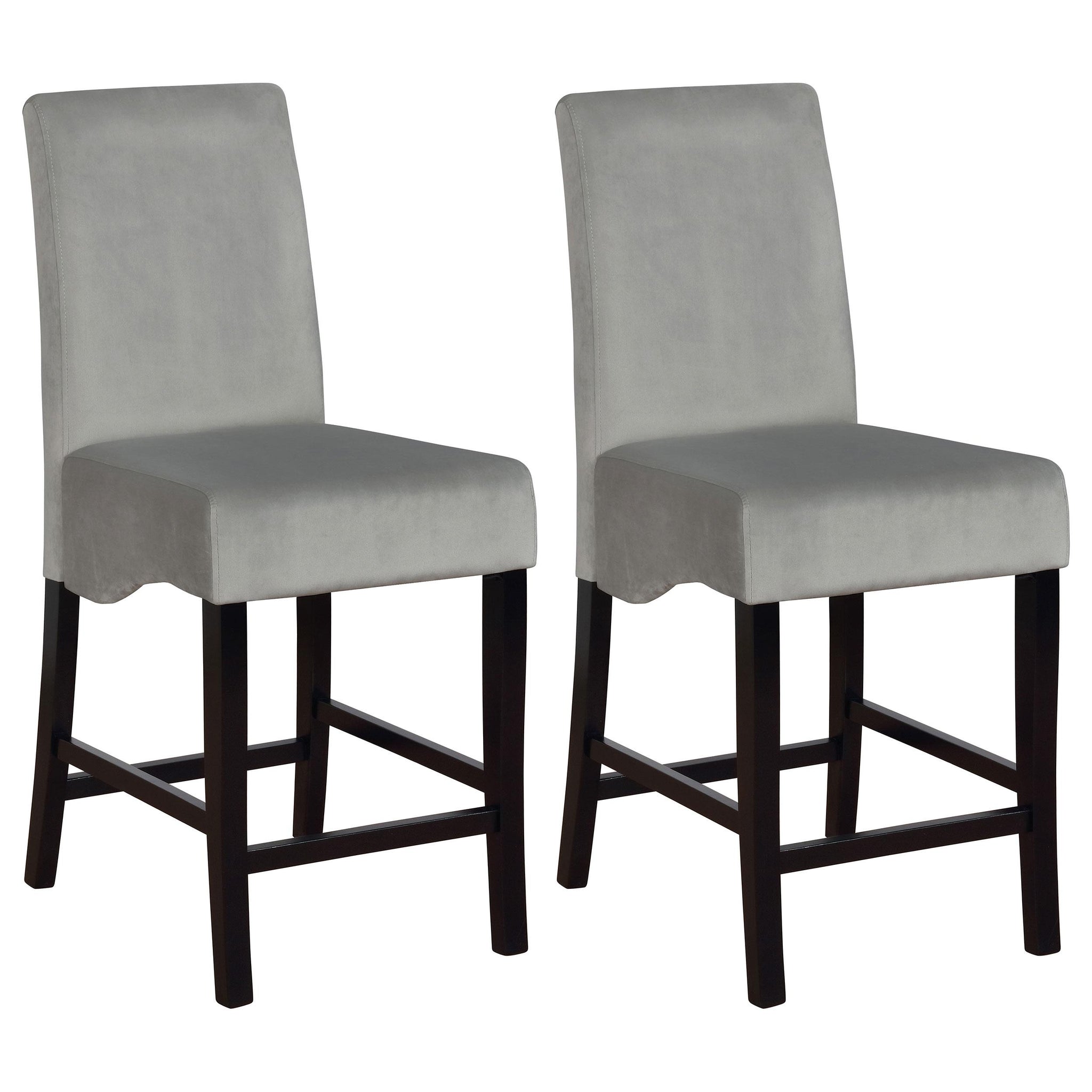 Upgrade your dining space with these elegant counter-height dining chairs. Designed with a classic Parsons silhouette, these chairs feature plush grey velvet upholstery for a soft, luxurious feel. The solid rubberwood frame, finished in deep black, offers durability and a striking contrast. A gently curved seat provides lasting comfort, while a built-in footrest ensures support. Perfectly complementing modern or transitional settings, these chairs add sophistication to any counter-height dining table.