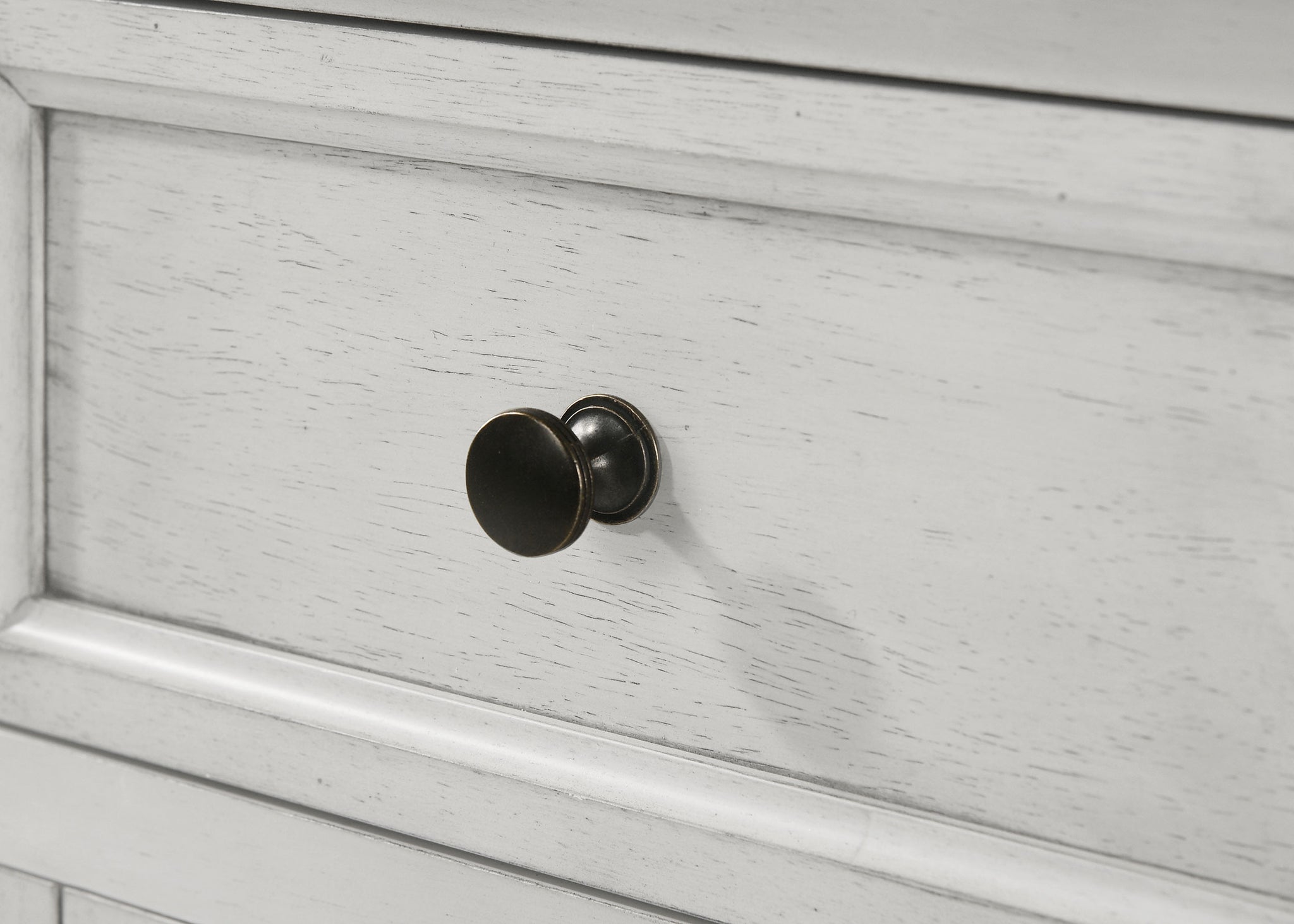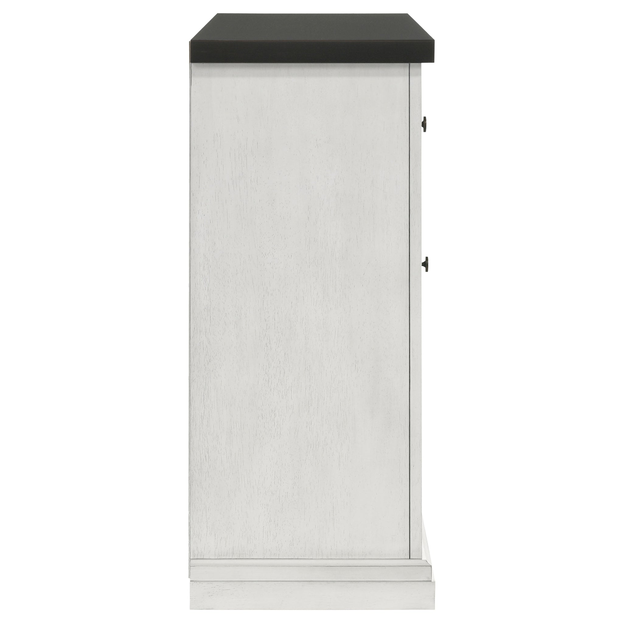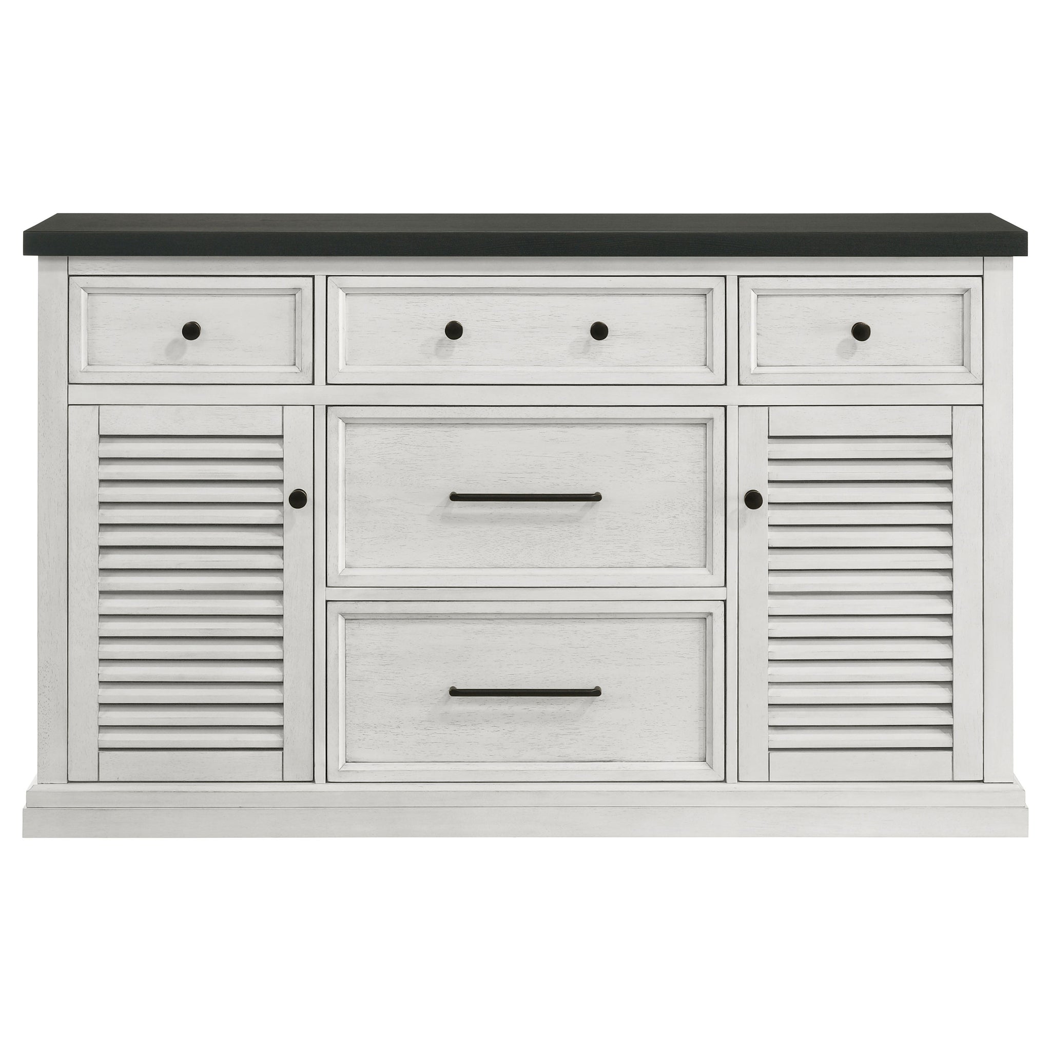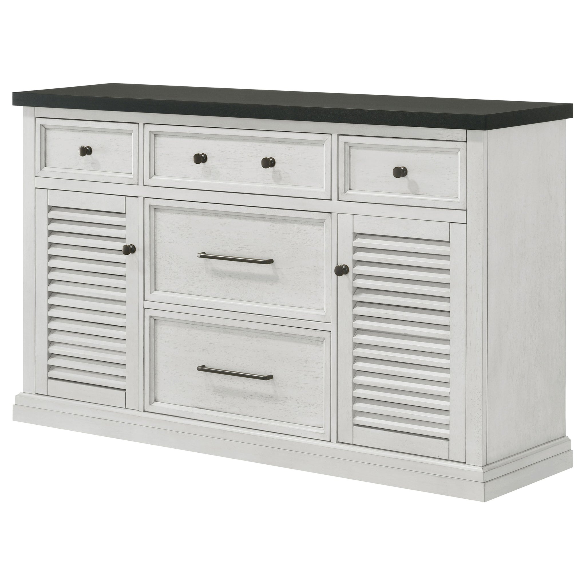 Evoke a comfortable and welcoming modern farmhouse ambiance with a charming five-drawer sideboard added to your dining room. The versatile piece offers plentiful storage with three smaller top drawers, all with felt lining, that are perfect for accessories and linens. Two larger lower drawers are also lined with felt and make a perfect spot for serve ware and other dining essentials. On each side, cabinets add even more space for storage, with louvered doors that deliver a perfect hint of rustic character. The sideboard features a charming two-tone finish complete with a charcoal sand-through finish on top and a vintage chalk white finish on the base that create a stylish combination.