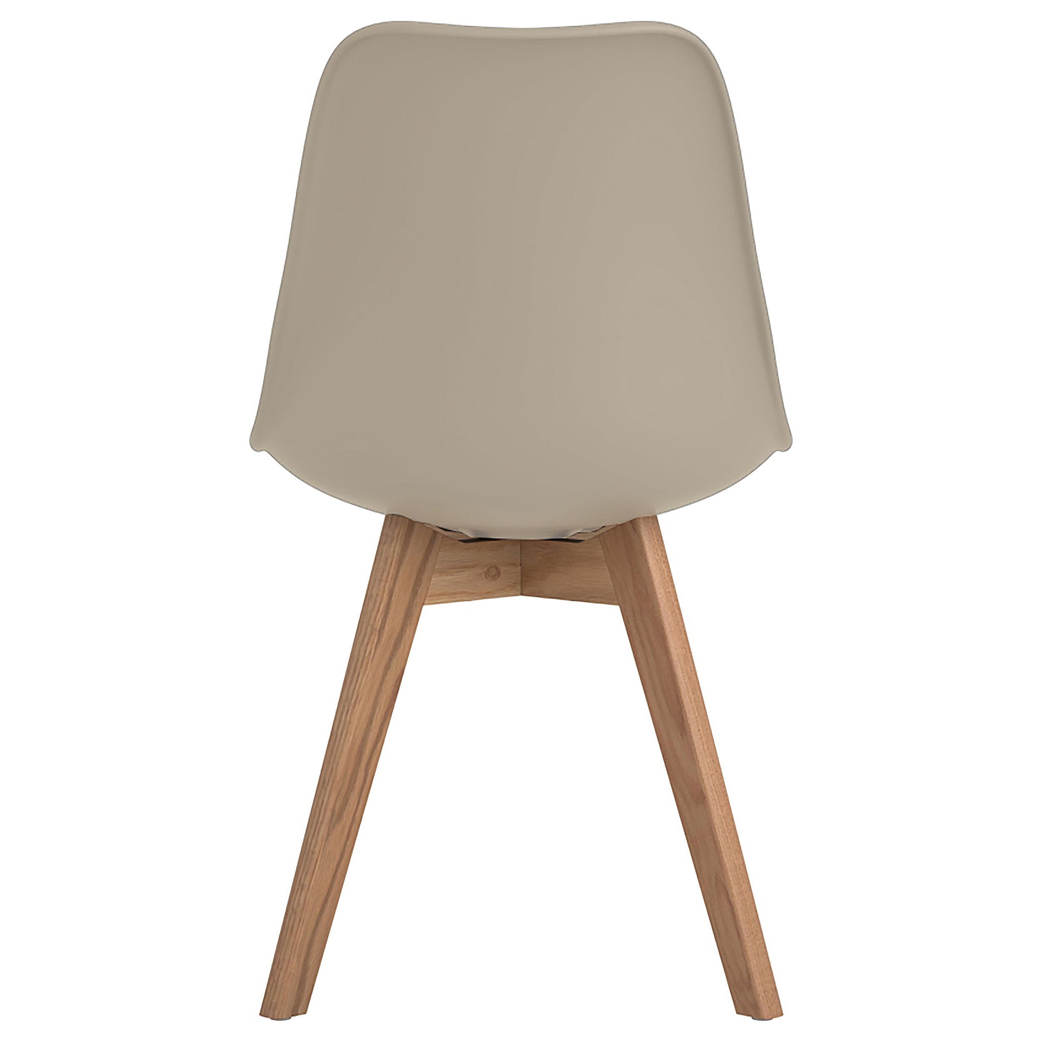 Add a touch of mid-century charm to your dining space with this tan side chair. The smooth faux leather seat and angled oak wood legs create a warm, modern aesthetic. Designed with durability and comfort in mind, it features a padded seat and a resilient polypropylene shell. This accent chair blends style and function, making it a perfect fit for contemporary and transitional dining areas.