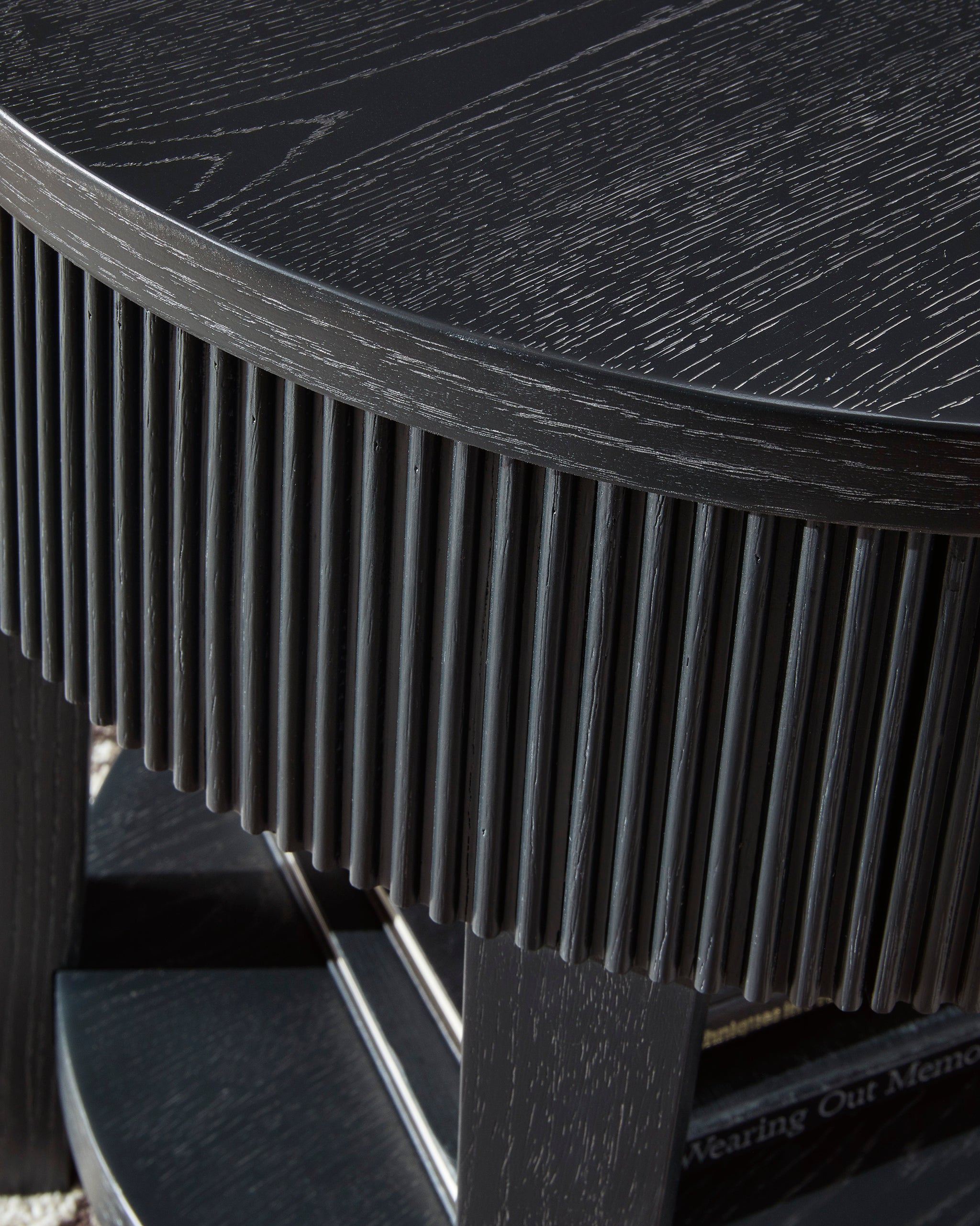 Classic and cool in dark charcoal, this end table brings contemporary convenience to your living room. Short on storage? The trendy reeded apron conceals a drawer perfect for remotes, controllers and other entertainment accessories. What a perfect marriage of style and functionality.