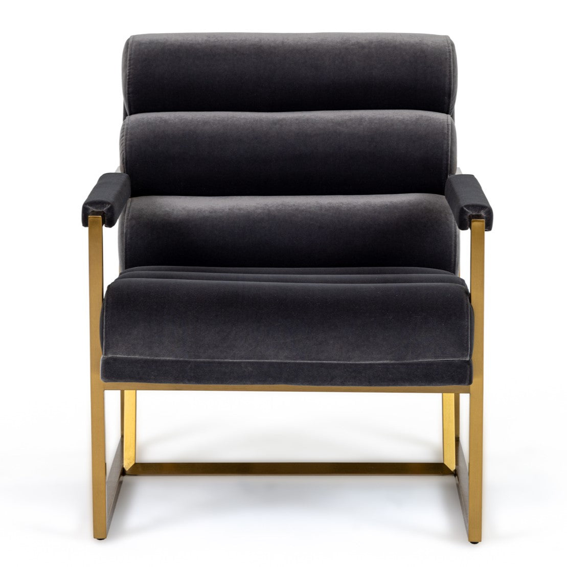 Introducing the Modrest Anton Accent Chair, a stunning blend of modern design and comfort. Upholstered in luxurious grey velvet, it features plush, contoured cushioning for ultimate relaxation. The chair is accentuated by sleek brass legs, adding a sophisticated touch to its contemporary silhouette. With its elegant lines and high-quality materials, this chair is perfect for enhancing living spaces, making it both a stylish and inviting addition to any room. Ideal for cozy corners or as a statement piece in your lounge area.