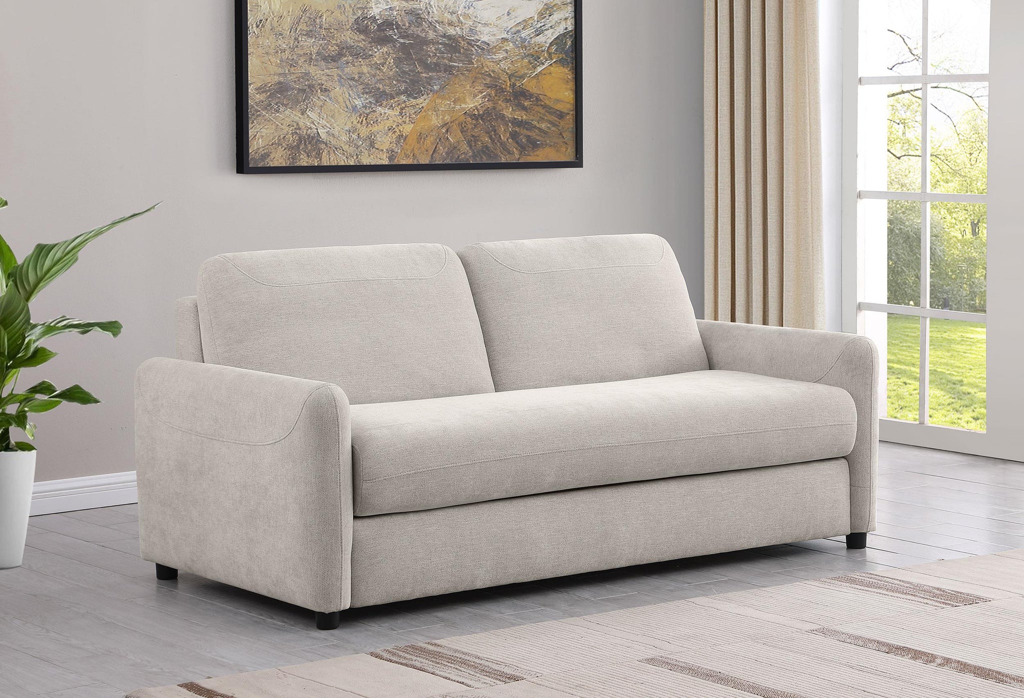 Add a versatile spin to your living space with a modern sleeper sofa that lends sleek style and optimal comfort. This functional seating solution features slender rounded track arms and bench-style seat cushions that will complement your décor. The sofa, with its soft beige upholstery and clean-lined profile, hides a convenient sleep space for overnight guests, transforming into a bed with ease in one step using a pull handle located at the top backrest. Offering comfort and support, the sofa converts to a queen-size sleep surface that includes a memory foam pad, layered over foam cushioning for a luxurious feel. The seaming details add a tailored touch to this lovely sleeper sofa, making it the perfect choice for a multi-functional home office or compact living room.