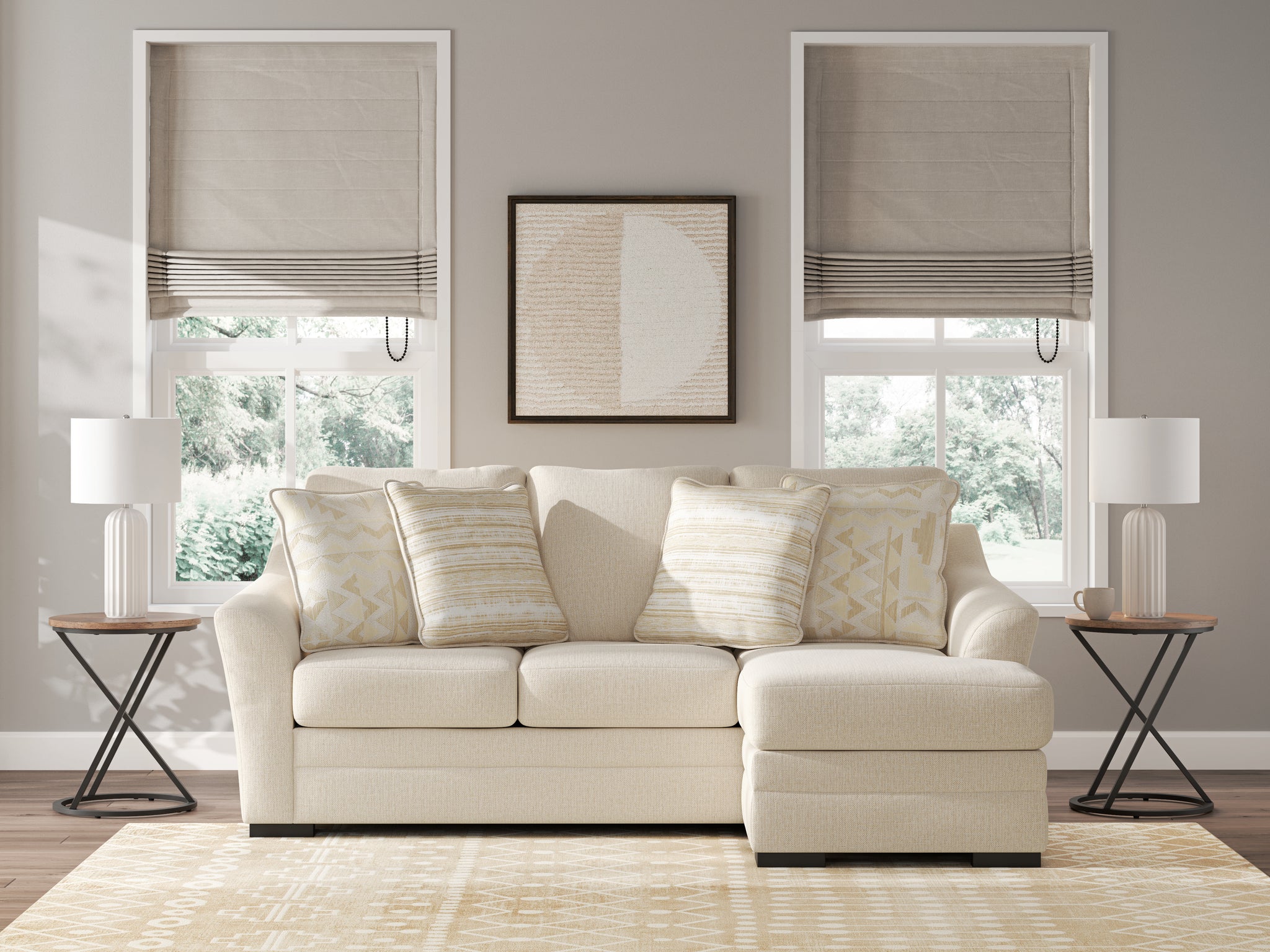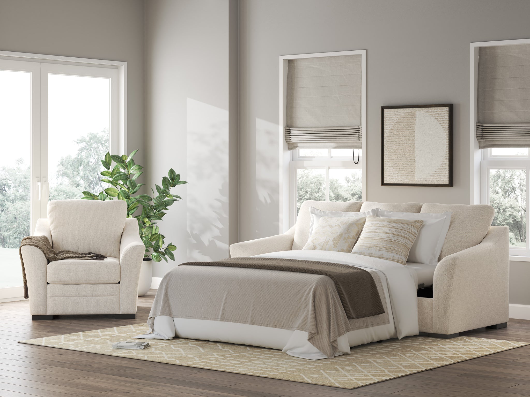 Gently flared arms. Soft neutral fabric that goes with anything and everything. Theres a lot to love about this sofa chaise sleeper. With its easy-to-clean Next-Gen Nuvella™ fabric, upkeep is a breeze, making it the perfect choice for high-traffic areas and active households. A pull-out queen mattress in quality memory foam accommodates overnight guests in pure comfort and style.