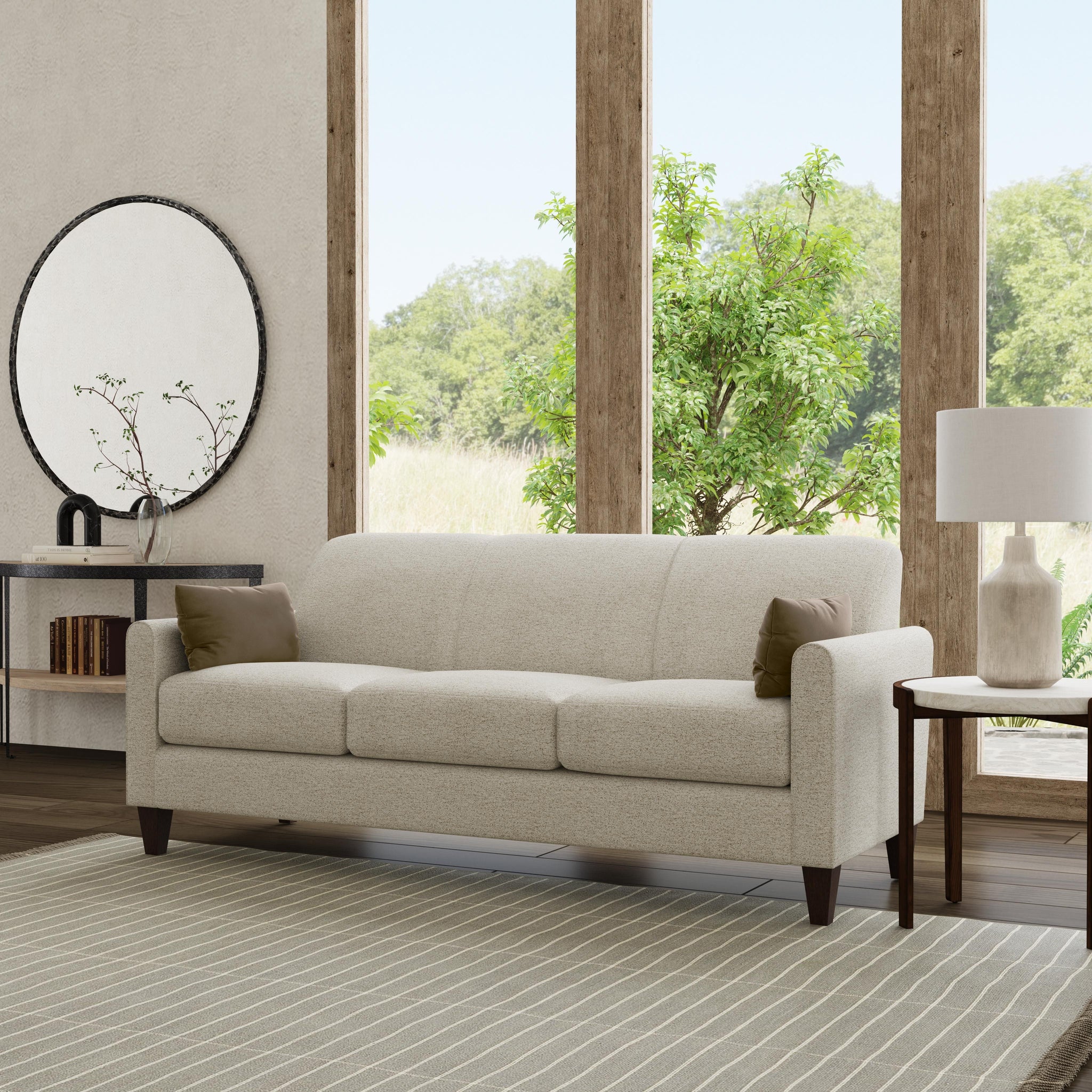 Structured Style. Add a touch of cosmopolitan allure to your living space with the Bond sofa. Its sophisticated mid-century style delivers clean lines with a structured tight-back design and refined welt trim. Mailbox-style arms soften the silhouette, while the included lumbar accent pillows add style. Square tapered legs, available in three finishes, and the ability to upholster in your choice of fabrics ensures you achieve the perfect look.