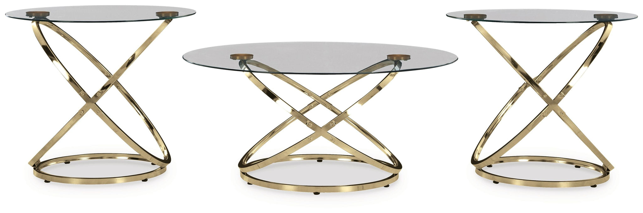 Fall in love with the contemporary design of this accent table set. Crafted with tubular metal in a captivating champagne goldtone, each features a sleek drum design. The clear tempered glass tabletop offers both style and durability. Create a stunning focal point in your home with these one-of-a-kind tables.