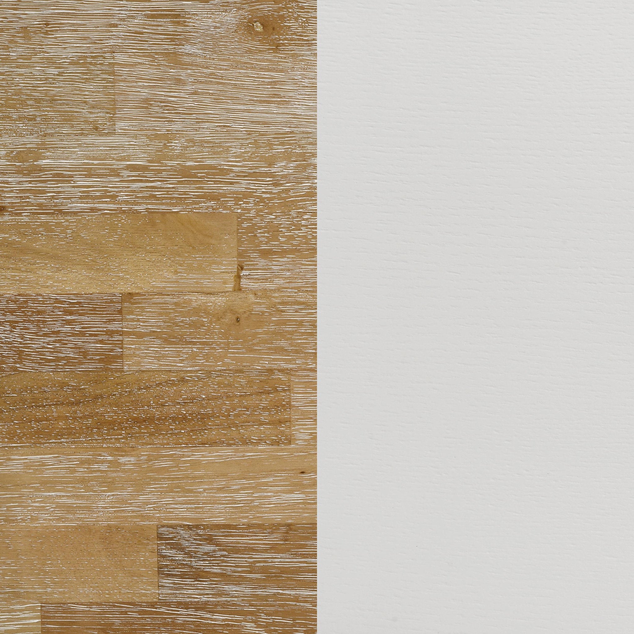 • Wire brushing adds rustic distressing to a modern farmhouse sideboard with two-tone look and natural wood top and crisp white base