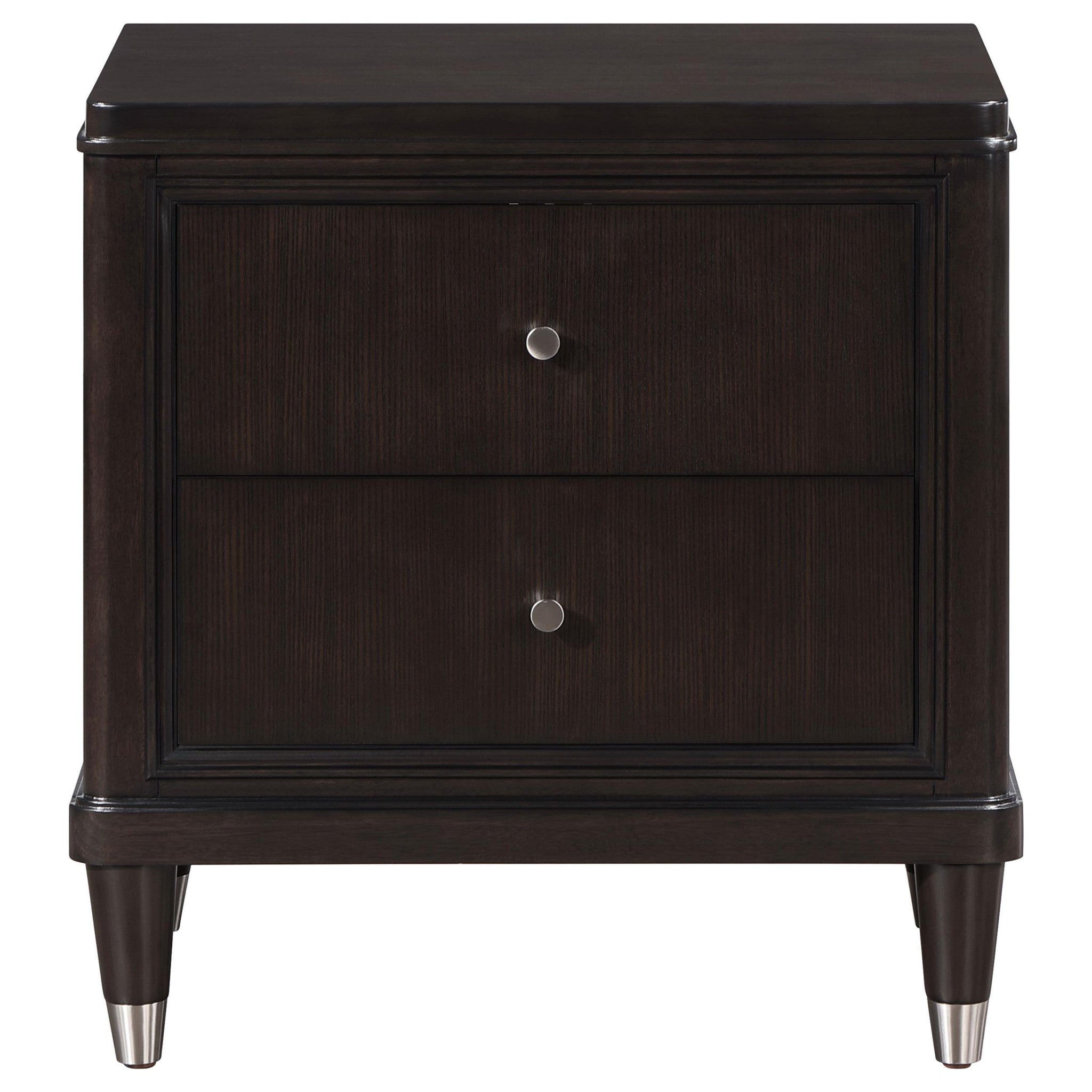 Accentuate bedroom decor with the chic look and impressive functionality of a modern two-drawer nightstand. Its sleek look is accentuated with delicate trim and petite round knobs on each drawer. A dark brown finish ensures a versatile palette, complementing in a variety of bedroom settings to create a warm, soothing ambiance. The top drawer includes felt lining and the bottom drawer cedar, adding protection to your bedside storage. Tapering feet complete the look with metallic finish caps, offering a touch of contrast and depth at your bedside.