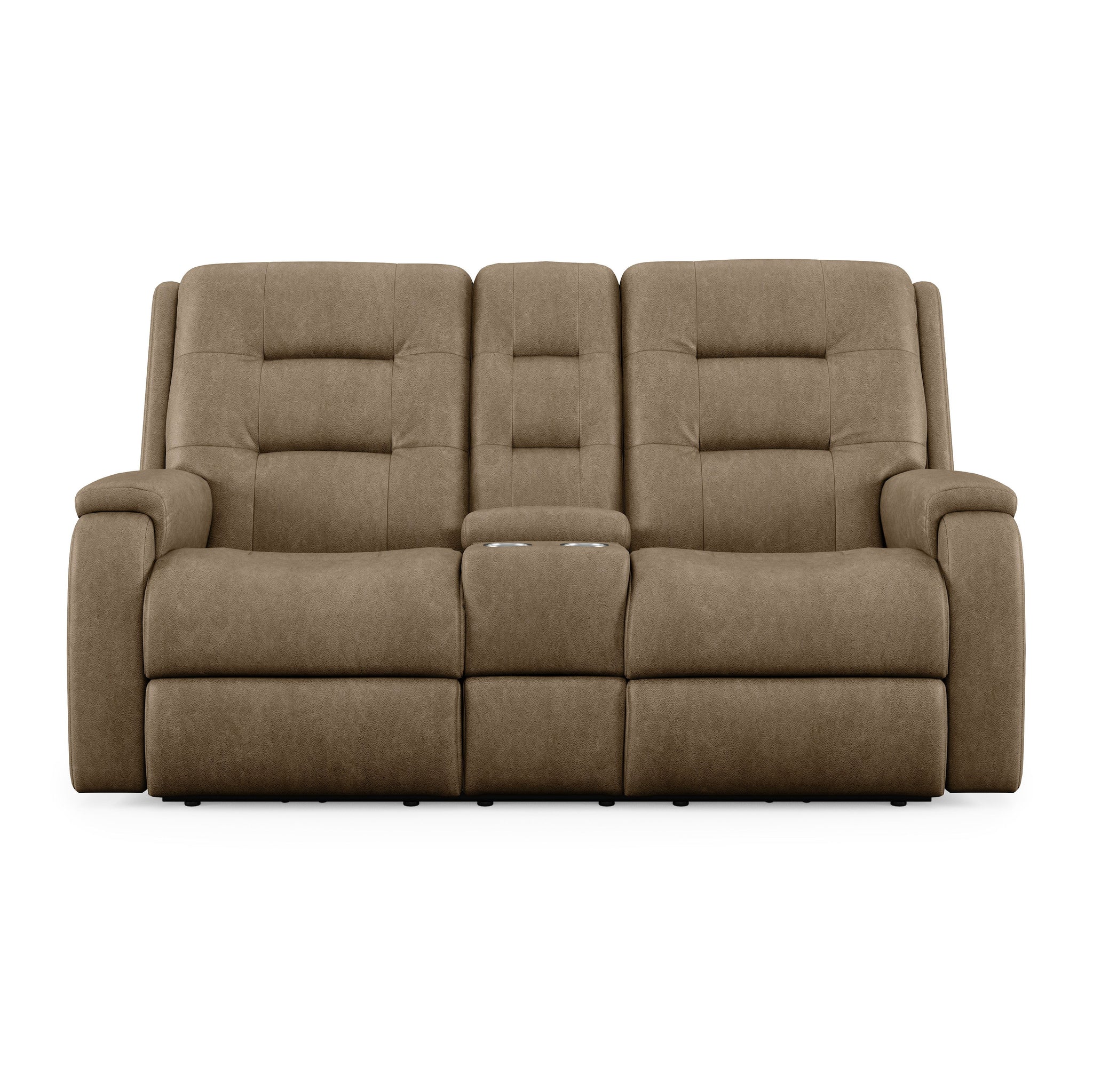 Supportive Style. Take comfort to the next level with the Arlo Power Reclining Loveseat with Console. Available in our premium leather upholstery, this loveseat will add refinement to any living space. The spacious center console includes storage for glasses, magazines and other personal items and features two cup holders. Easy-to-access power controls with built-in USB charging ports in both arms allow you to independently adjust the headrest and recline, dialing in the right level of comfort for each person. Designed for optimal support, Arlo has pull-tufted, triple-divide back cushions that cradle your head, neck and lower back. Contoured seats take pressure off your legs as you sit, while our patented DualFlex Spring System™ provides firmness and flexibility. Rounded pad-over track arms provide a comfy place to rest your forearms — great if you’re spending hours gaming or streaming movies. To make Arlo your own, choose from more than 50 leather or leather match options.