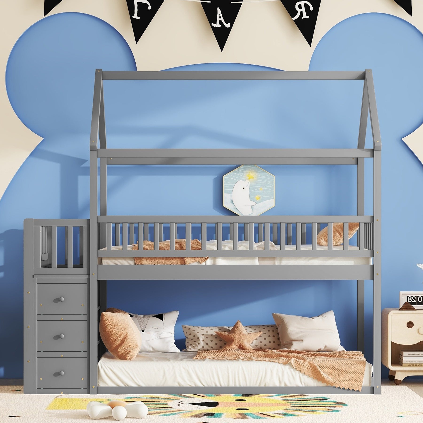 - [Storage Functions and Space-Saving]: The storage shelves and drawers provide an organized haven for books, toys, and other items to stock that not only make the most of space but also help to develop kids' habit of storage. Moreover, this bunk bed has a twin-size bed on the top and a twin-size bed on the bottom or as a playing area, which saves space to the greatest extent. Our bunk bed promotes both comfort and charm.