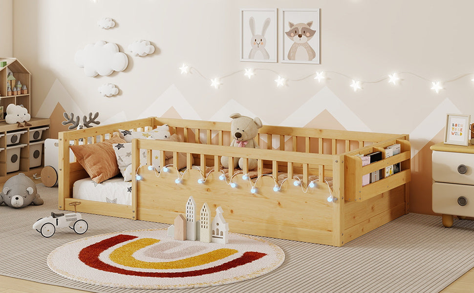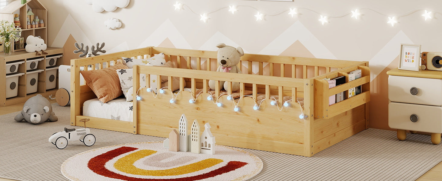 Twin Montessori Floor Bed Frame with High Rails and Storage Shelf, Natural