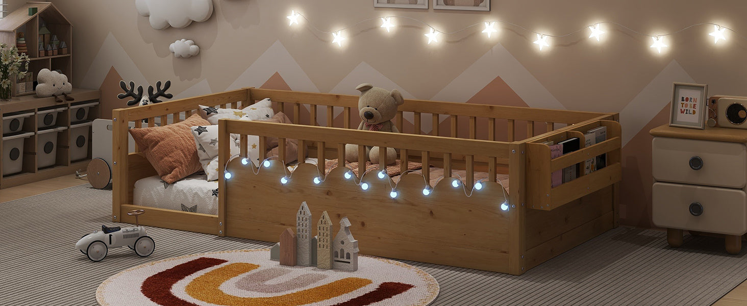 - Floor Bed with Light and Storage Shelf -The twin floor bed come with LED light to DIY wrap on the bed which provide a dreamlike atmosphere and makes your kids bedtime smart and ensuring safety and comfort when getting up in the dark. The storage shelve at side of the floor bed for books that easy to touch when have reading time. The storage shelf can be installed at both left and right side.